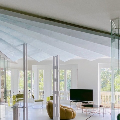 Los espacios detrás de las paredes divisorias de vidrio se definen por colores densos, muebles y materiales, y el espacio del salón por tonos claros. El interior se caracteriza por geometrías, texturas y colores en capas, que juntos forman un contexto para vivir hedonista y abierto.