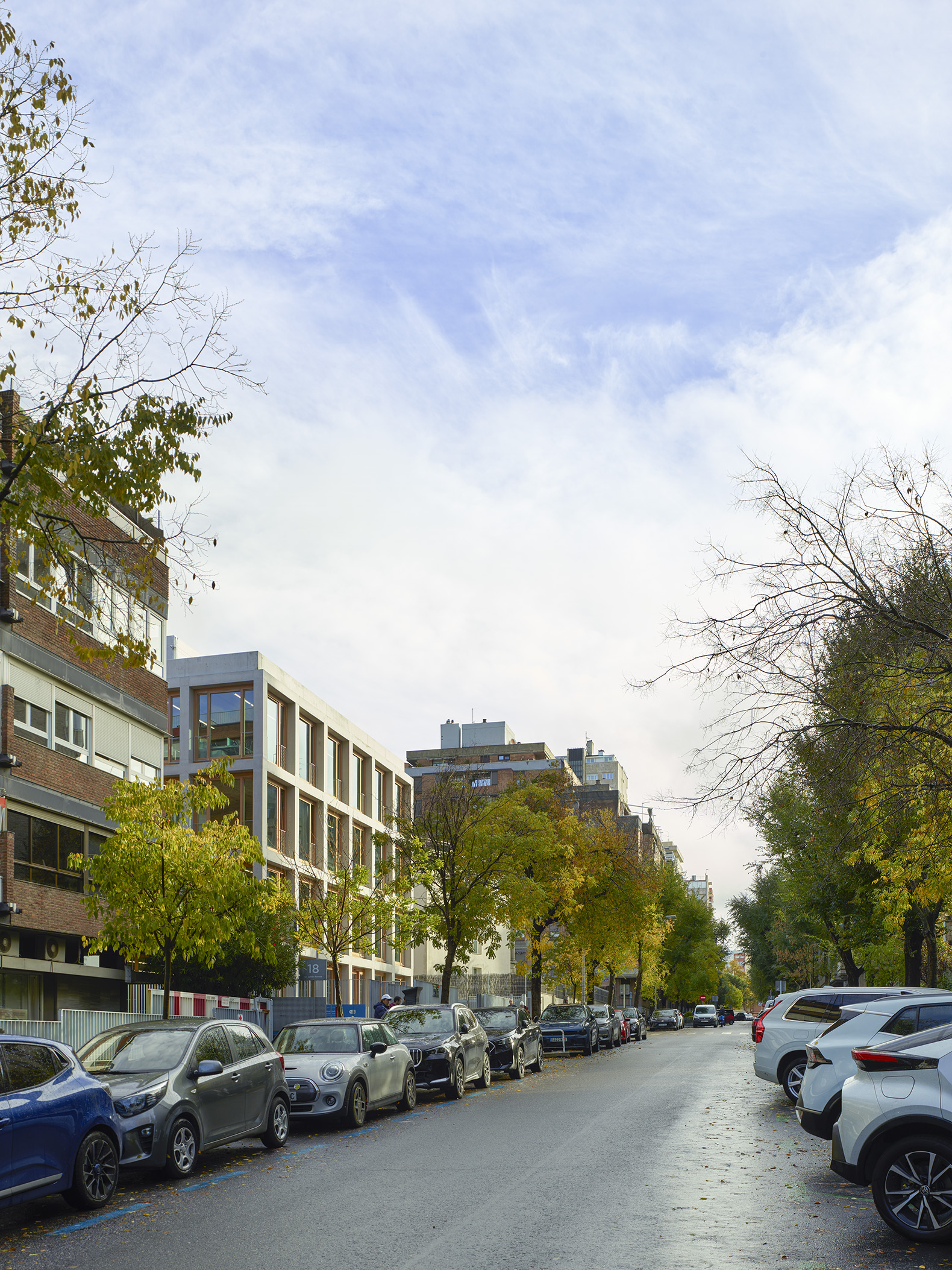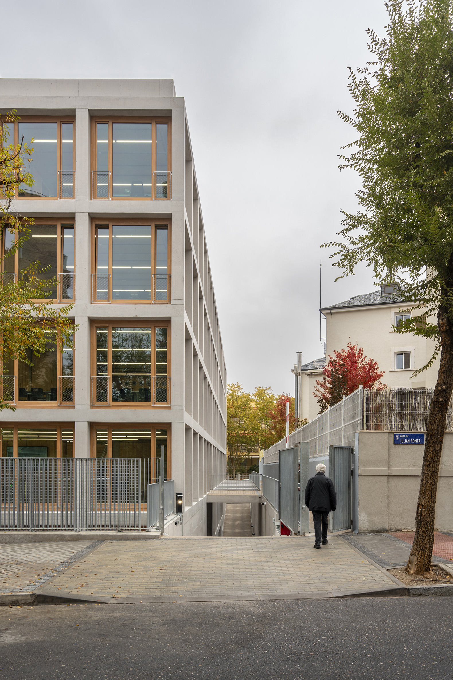 El proyecto se configura a partir de un volumen compacto, organizado en torno a un patio inglés perimetral, el cual articula el programa docente y permite garantizar la correcta iluminación y ventilación natural de todos los espacios. De este modo, la estrategia de implantación del edificio parte del vaciado del solar para generar una nueva planta de jardín, rodeada de un espacio de estancia al aire libre. Esta operación define el acceso principal al edificio, que se produce a través de una pasarela sobre el patio que conecta la calle Julián Romea con la planta baja.