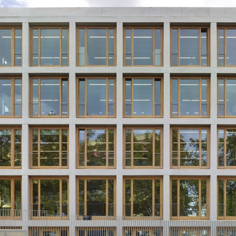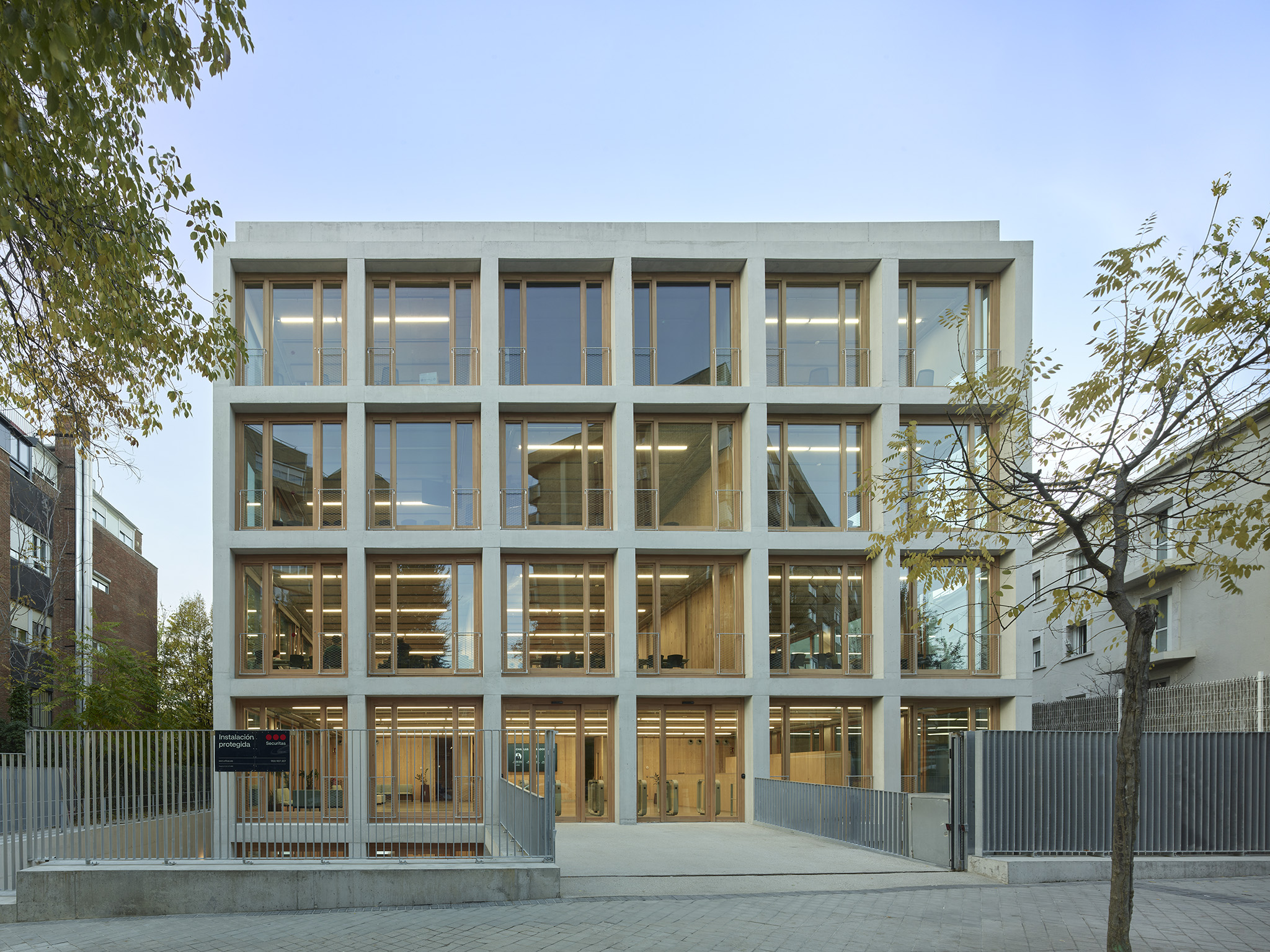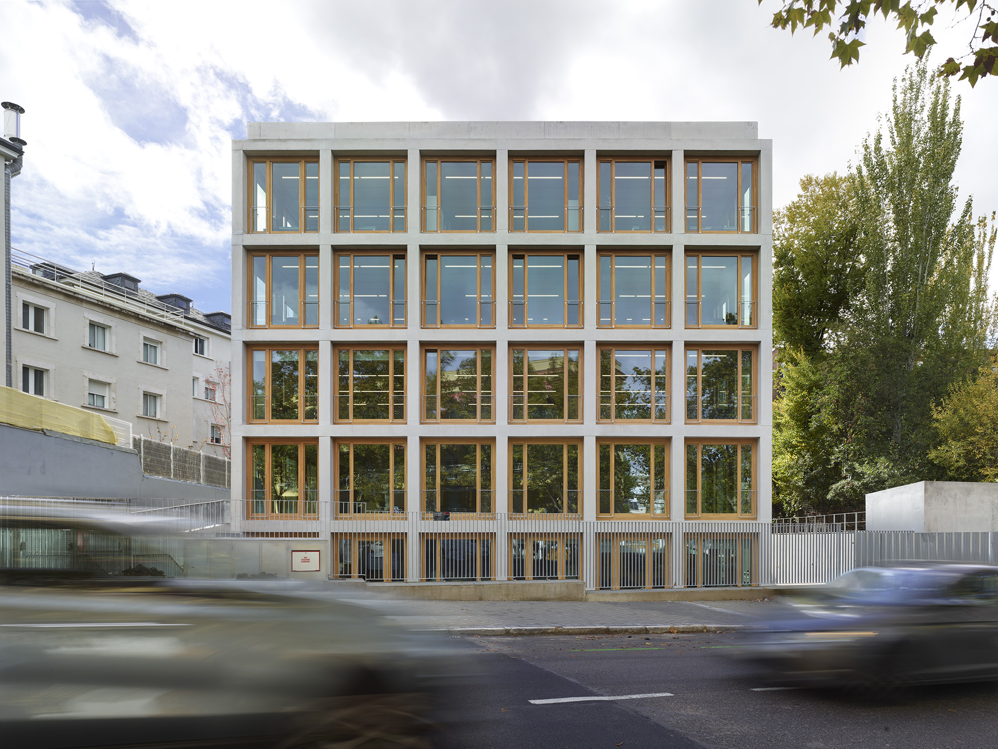 La industrialización del proceso permitió trabajar de manera paralela en obra y en taller, acortando los plazos de ejecución. Esta dualidad, se manifiesta también en fachada, donde las carpinterías exteriores de madera se ensamblan a la estructura. El orden de la trama estructural se altera puntualmente con la introducción de una serie de vigas vierendeel de sección mixta, situadas en plantas alternas, que permiten liberar de pilares espacios más diáfanos en los cuales se ubican el aula magna, el vestíbulo de acceso y las aulas con tabiquería móvil.