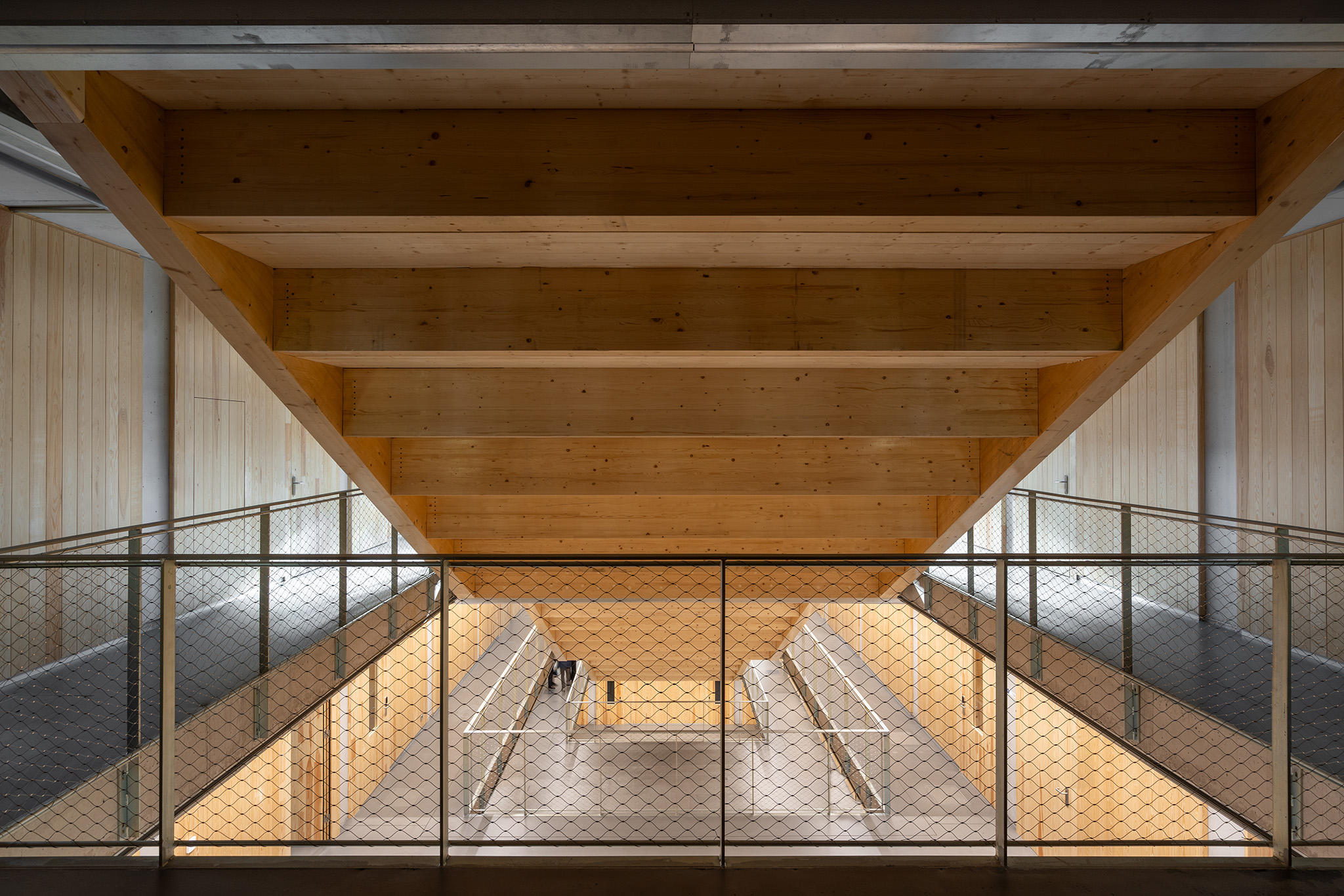 Constructivamente, el proyecto se resuelve mediante un sistema mixto, compuesto por una estructura reticular de hormigón ejecutada in situ y una serie de elementos prefabricados de madera contralaminada CLT -gradas y paneles verticales- que configuran el interior del edificio.