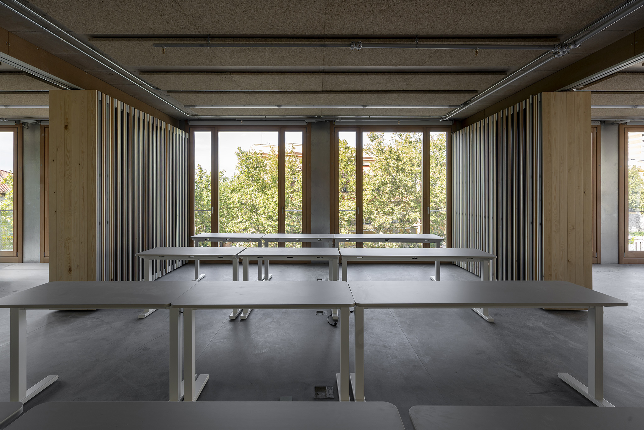 Un gran vacío central conecta las distintas plantas a través de una serie de gradas de madera contralaminada. De este modo, una concatenación de espacios estanciales, sobre la grada y bajo la grada, permite la relación espontánea de los usuarios. El atrio hace de gran intercambiador térmico permitiendo una renovación natural de aire; los exutorios en cubierta permiten una ventilación natural durante los meses de primavera y verano.