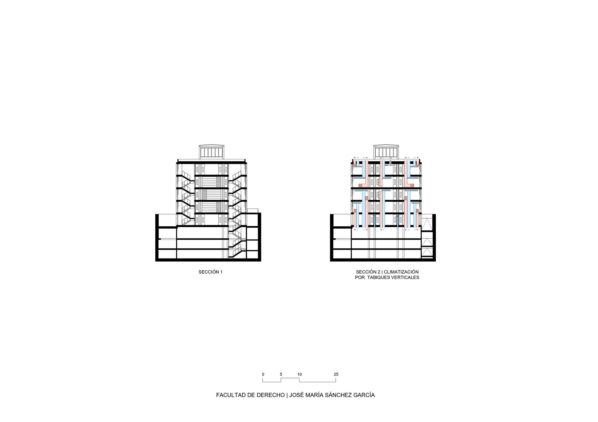 El edificio desarrollado por José María Sánchez se articula en torno a un gran vacío central en forma de atrio, que conecta tanto visualmente como físicamente todos los niveles. Este espacio se organiza mediante gradas de madera que generan múltiples situaciones de uso, favoreciendo la interacción espontánea. El programa se distribuye de manera clara: las áreas públicas en planta baja, las aulas en las plantas intermedias y los espacios docentes en la planta superior, todo ello vinculado mediante una serie de núcleos verticales y recorridos perimetrales, que refuerzan la relación entre los usuarios.