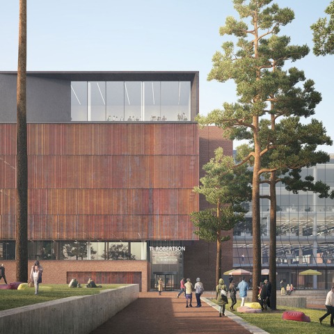 La remodelación de los espacios exteriores conectará mejor las entradas con el ámbito público. Henderson Court, un espacio verde en el lado sur del edificio, verá cómo se eliminan las barreras físicas y una gradación gradual del paisaje para crear un vínculo más directo con la entrada sur. Dentro de la biblioteca, un nuevo atrio creará una fuerte conexión entre el segundo y el tercer nivel, los cuales se extienden al paisaje. Un espacio de trabajo, una ubicación para eventos y nuevos espacios de enseñanza flexibles flanquearán una gran escalera con asientos incorporados.