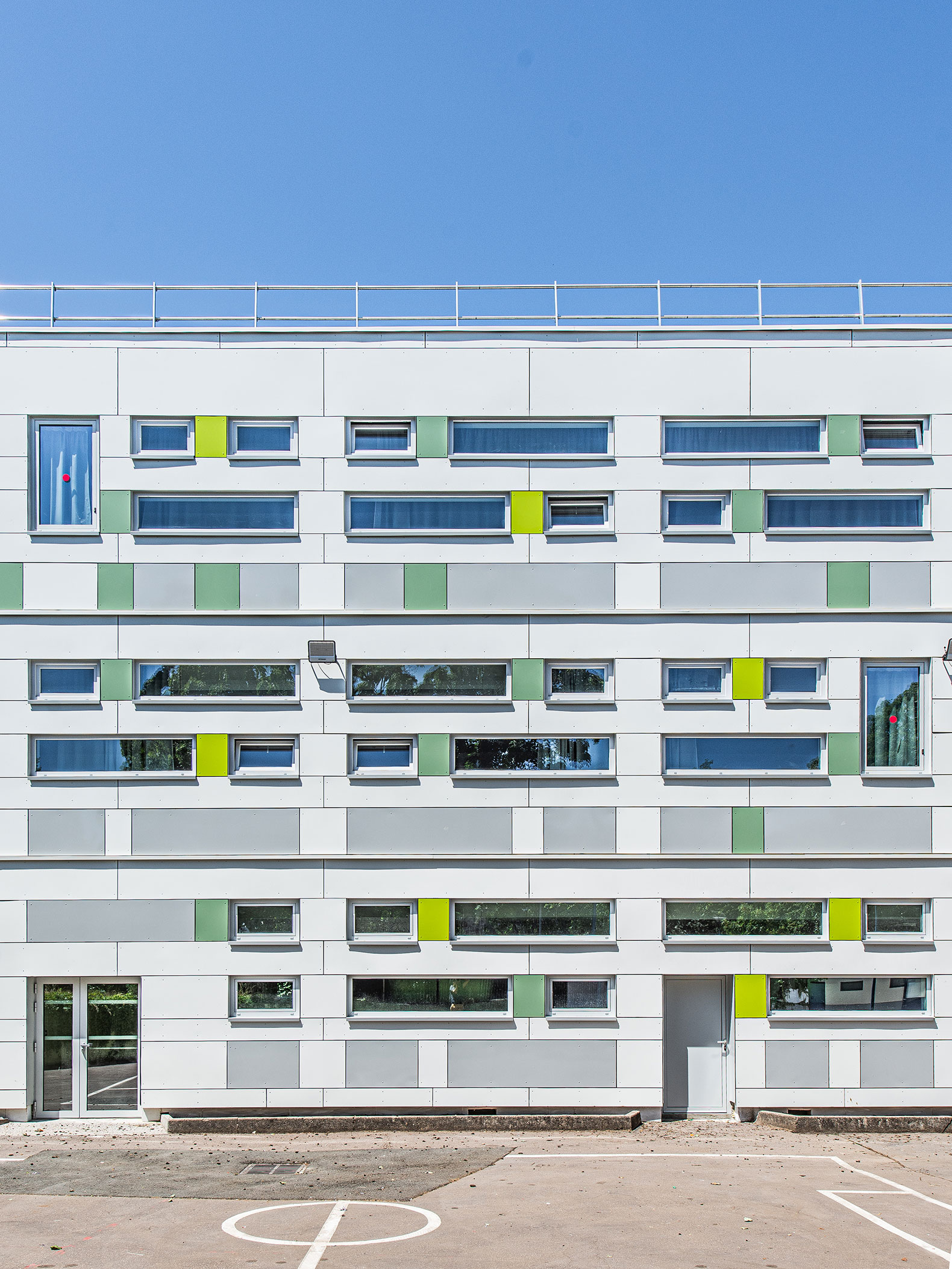 Las nuevas fachadas son una referencia explícita al estilo original de Émile Aillaud, con revestimiento de paneles compuestos de blanco, gris y verde que evocan su diseño original. Se añadieron puestos de bomberos para cumplir con los requisitos normativos. En el lateral de la calle Marguerite Yourcenar, las escaleras están aisladas del exterior y revestidas con paneles metálicos verticales acanalados de color verde, en referencia a la escuela ecológica de la década de 1960.