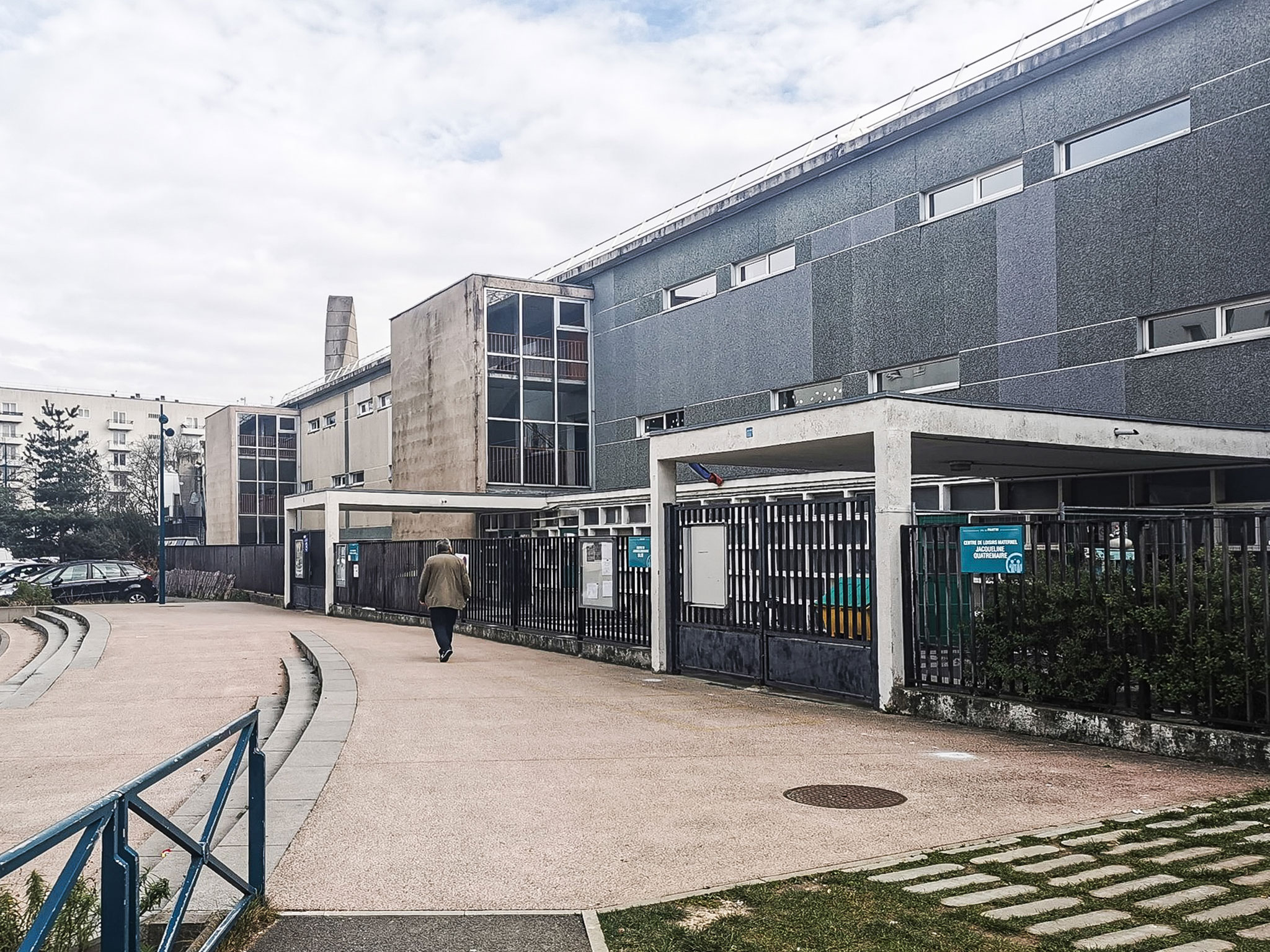 Construido en 1960, el conjunto escolar forma parte del programa arquitectónico de las Citédes Courtillières, un importante proyecto de vivienda urbana planteado por Émile Aillaud en la posguerra. Este centro también es conocido como la «escuela verde» por sus paneles de fachada prefabricados revestidos con losas de gres verde. El edificio lineal consta de dos plantas sobre una planta baja que alberga las aulas, con estructuras perpendiculares que albergan el patio de recreo y forman una disposición en forma de peine. Las fachadas se renovaron en 1986 con un revestimiento que cubrió por completo la arquitectura original: subestructura de ladrillo en la planta baja, revestimiento de amianto en la primera y segunda planta, e hileras de ventanas con alféizares rellenos en las aulas.