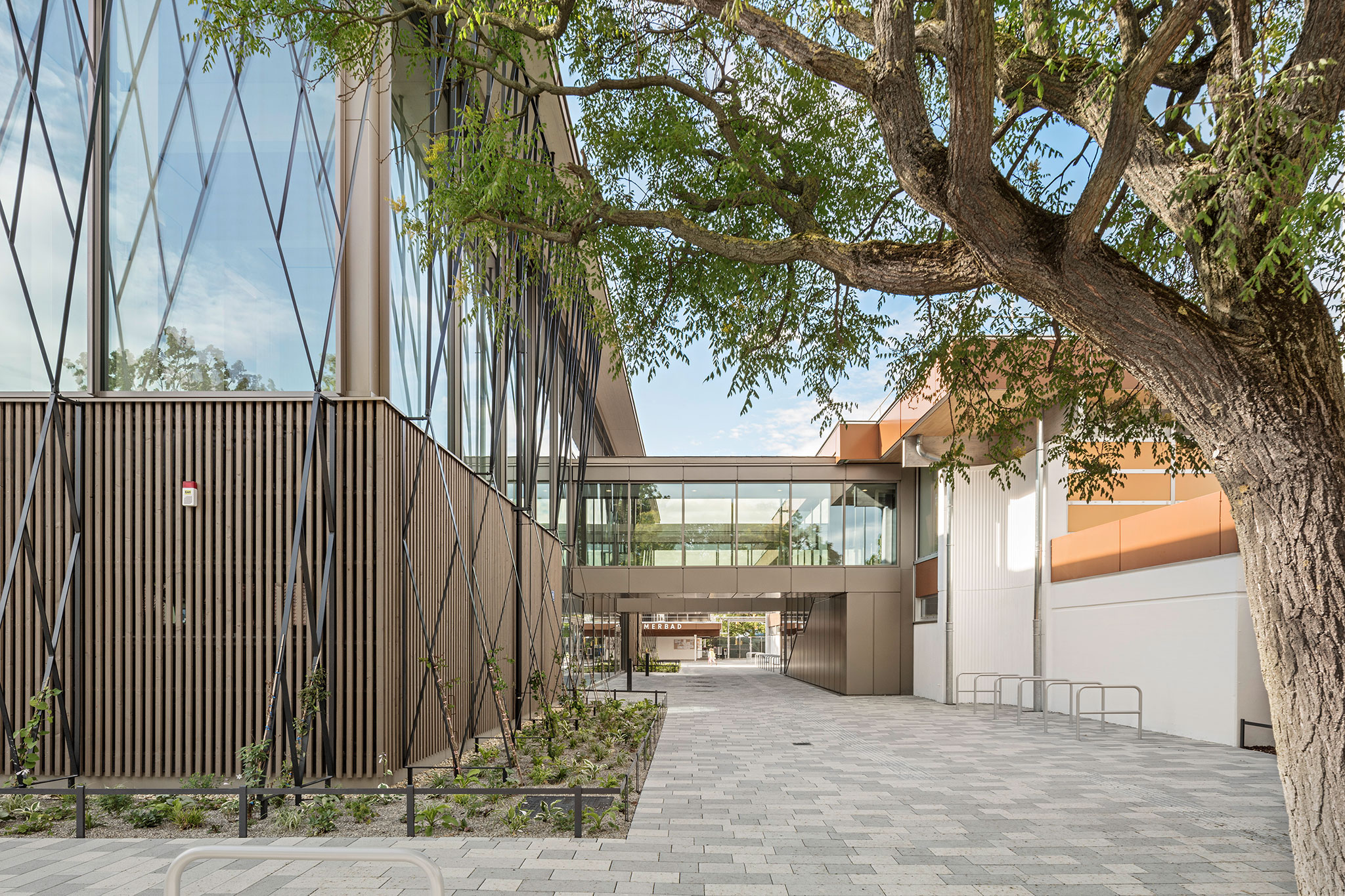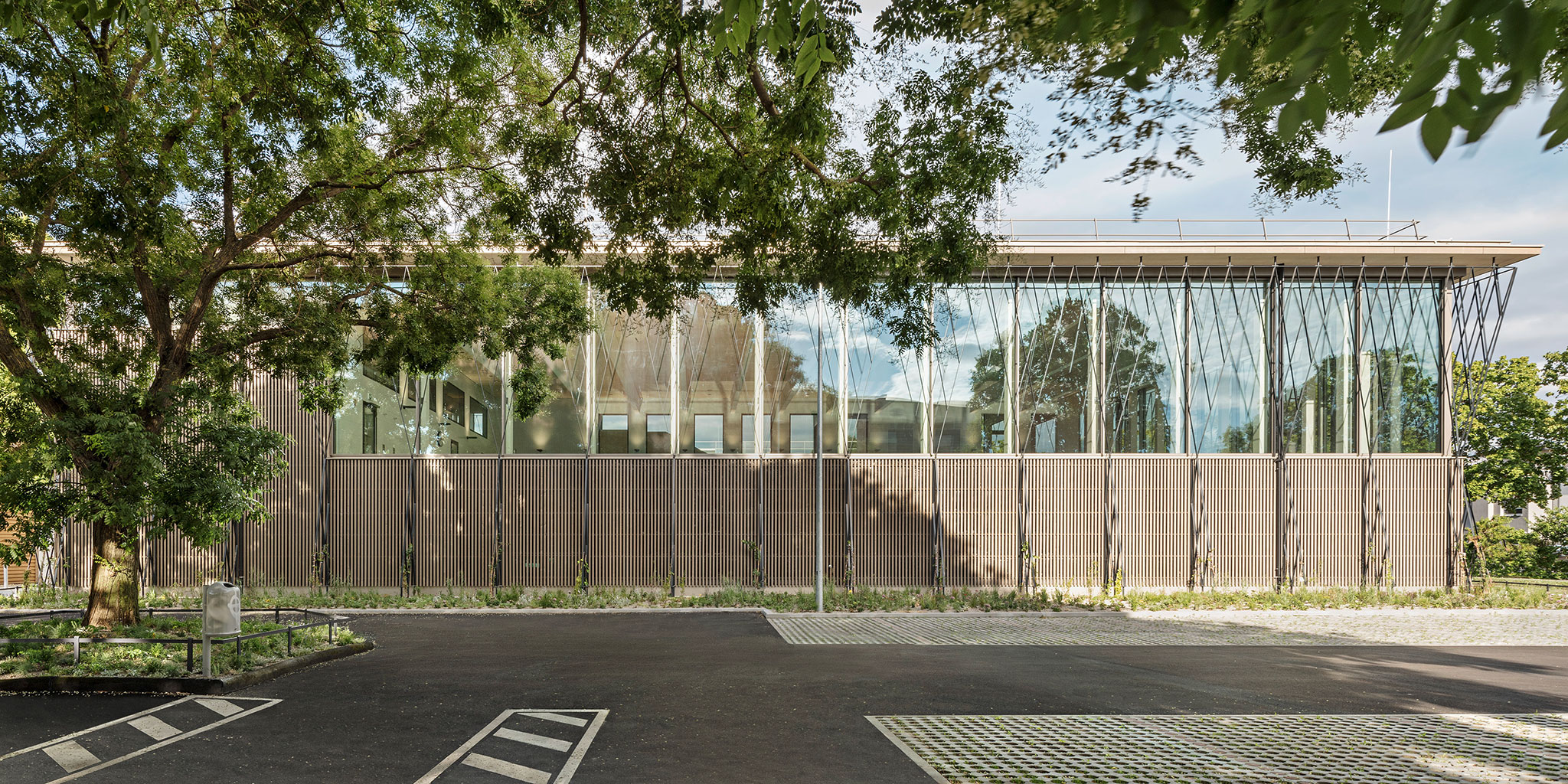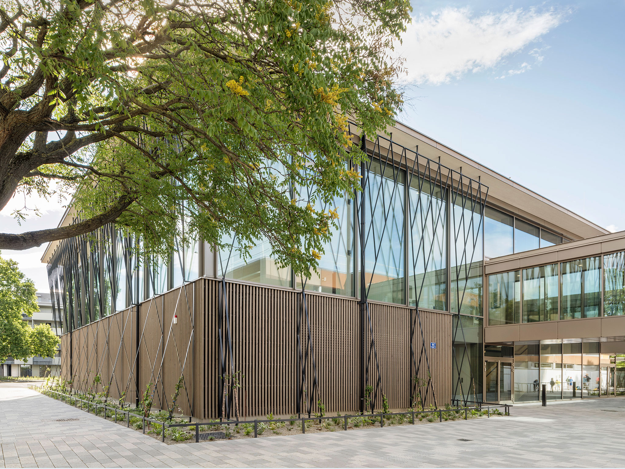 El estudio de arquitectura illiz architektur, con sede en Viena y Zúrich, diseñó un pabellón independiente de tres plantas que ocupa un espacio compacto en el solar de un antiguo aparcamiento. La nueva estructura se conecta al complejo existente mediante dos puentes voladizos. Entre lo antiguo y lo nuevo, emerge un pasaje verde que guía intuitivamente a los visitantes hacia las zonas de piscinas cubiertas y al aire libre y, bajo los puentes, los conduce a la nueva entrada principal. Aquí, la línea de fachada desciende hasta la planta baja y se expande en un frente acristalado de doble altura, tras el cual un luminoso vestíbulo de tres plantas constituye el nodo espacial central para la circulación por todo el edificio.