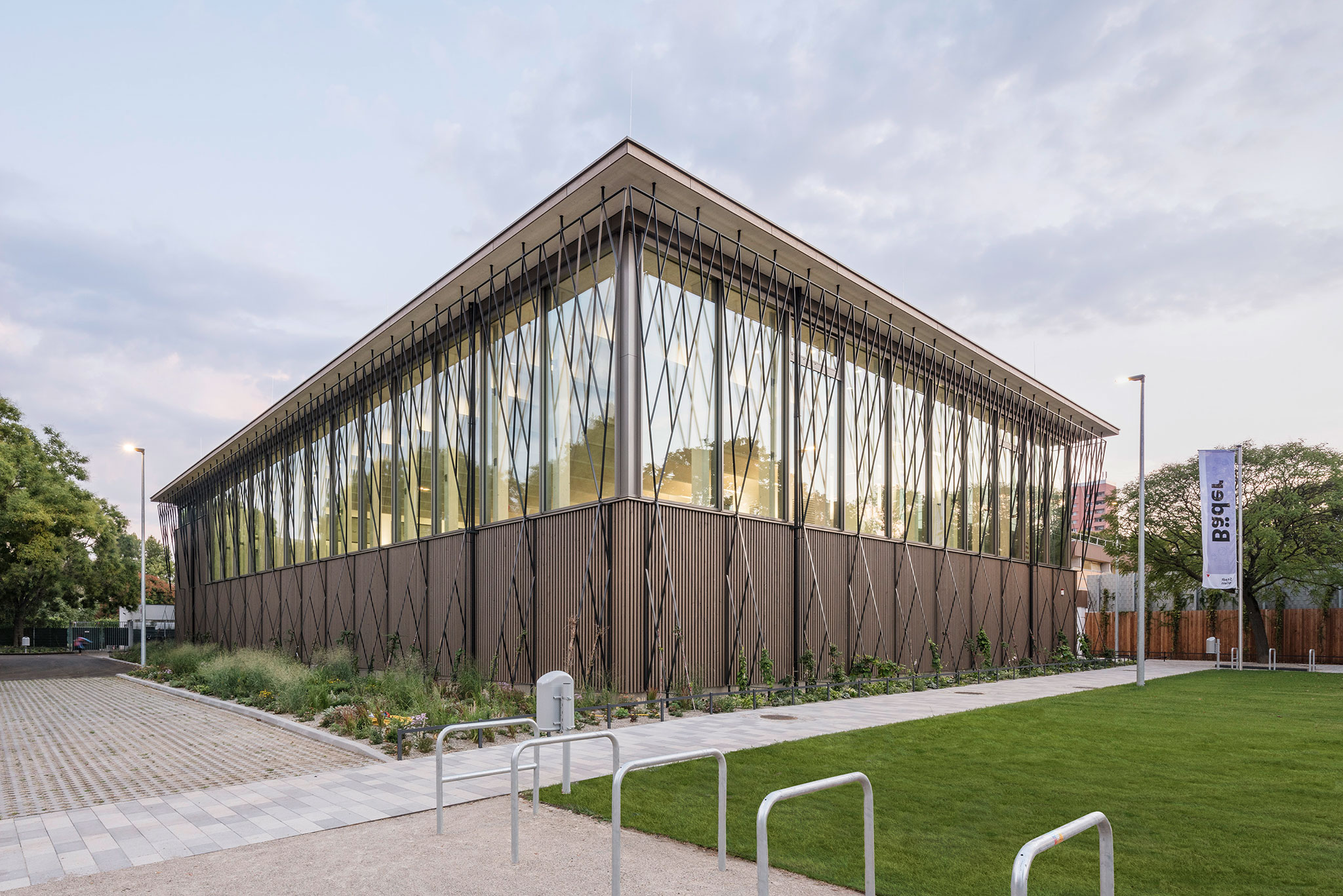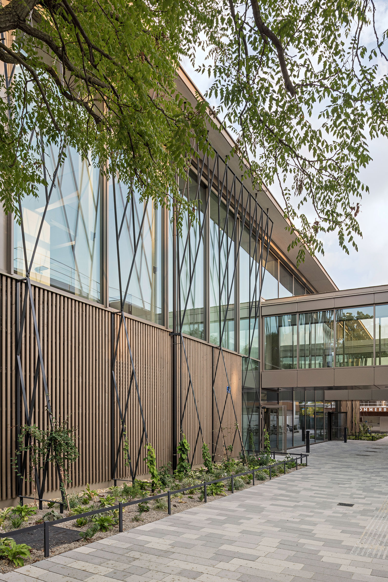 El diseño de la nueva ampliación hace referencia a la articulación de la fachada y a la distintiva línea de cubierta de las instalaciones existentes. Una gran losa de madera en voladizo y una serie de claraboyas definen la silueta del edificio. Una cinta horizontal, que alterna entre revestimiento de vidrio y madera, envuelve la estructura, articulando el programa interno de la sala, los vestuarios y el vestíbulo. En la parte delantera, una estructura de acero se extiende hacia la cubierta, ramificándose horizontalmente y sosteniendo una capa de vegetación que envuelve suavemente la nueva sala de entrenamiento con una pantalla luminosa y viva.