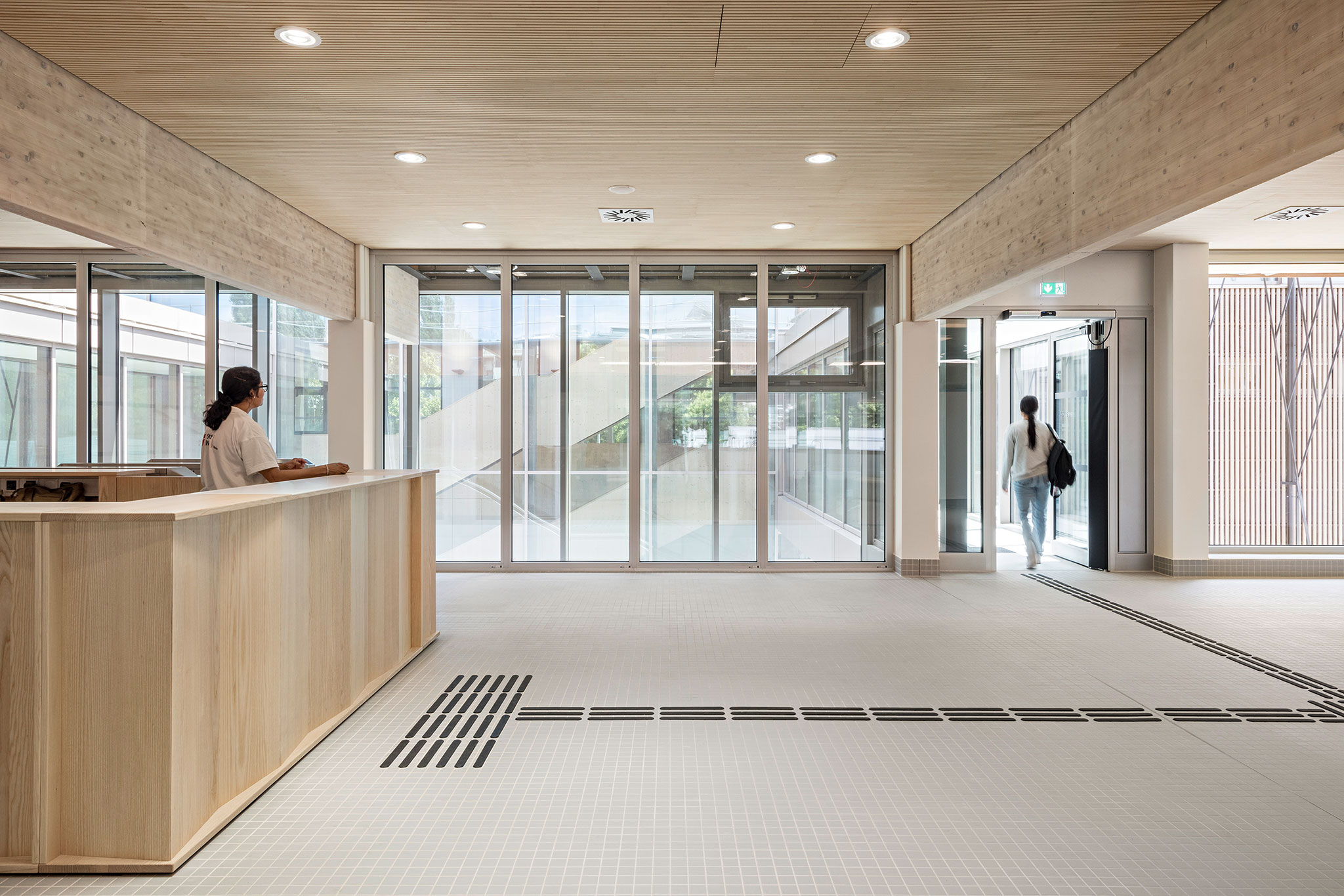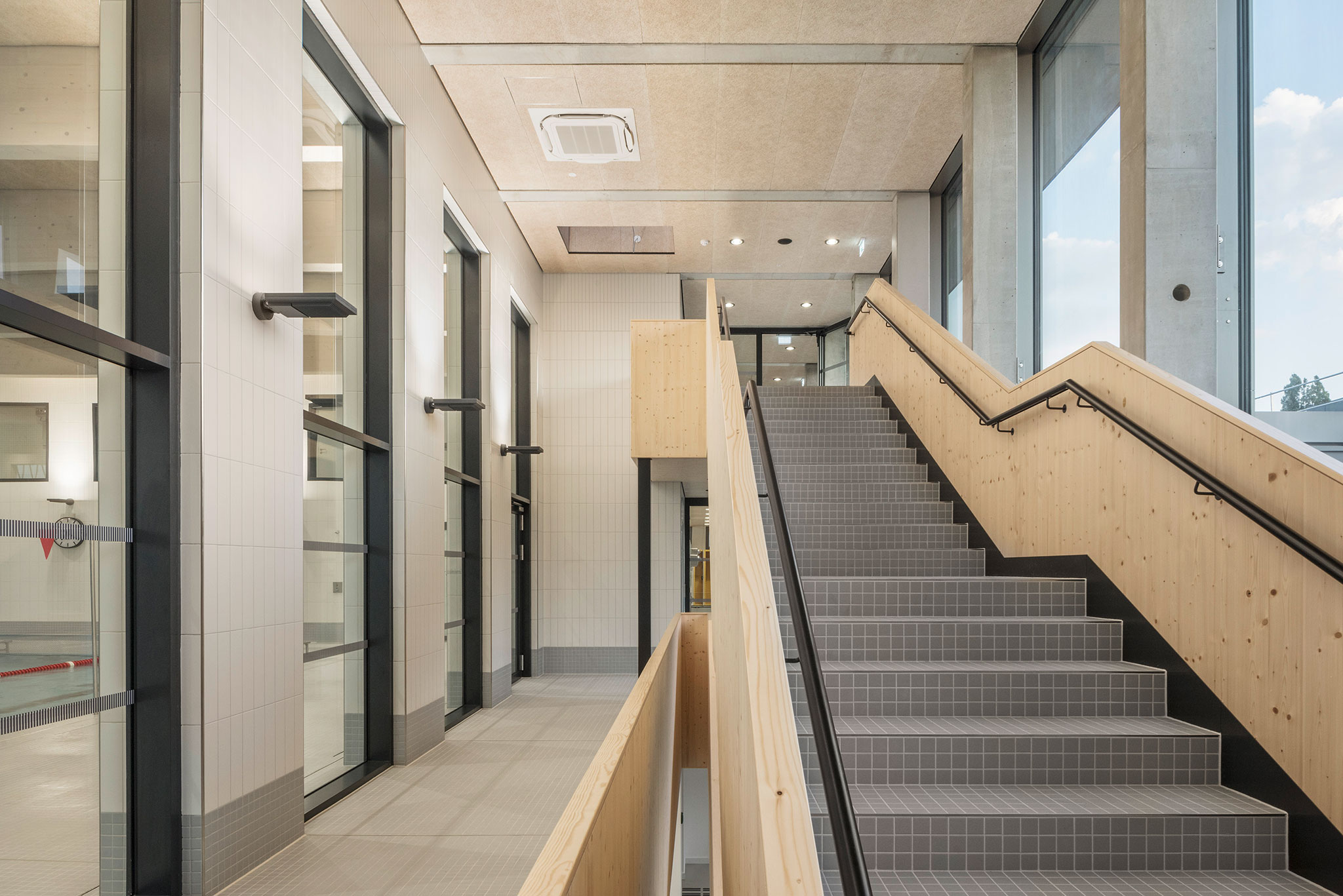 La piscina de 6 metros de altura está estructurada con una estructura de madera y rodeada por una fachada de cristal de suelo a techo. Frente a ella, la pasarela junto a la piscina se curva formando un banco de azulejos, sostenido por esbeltas columnas de madera. Los patrones de azulejos cuidadosamente compuestos en tonos neutros blanco y gris claro, combinados con superficies de madera clara, crean un ambiente luminoso y deportivo. Como parte de la remodelación, la sala existente también recibió una nueva cubierta elevada. Al reubicar la estructura portante, la piscina multiusos ahora se beneficia de una mayor altura del techo y de una luz natural suave y sin deslumbramiento que entra a través de aberturas laterales translúcidas.