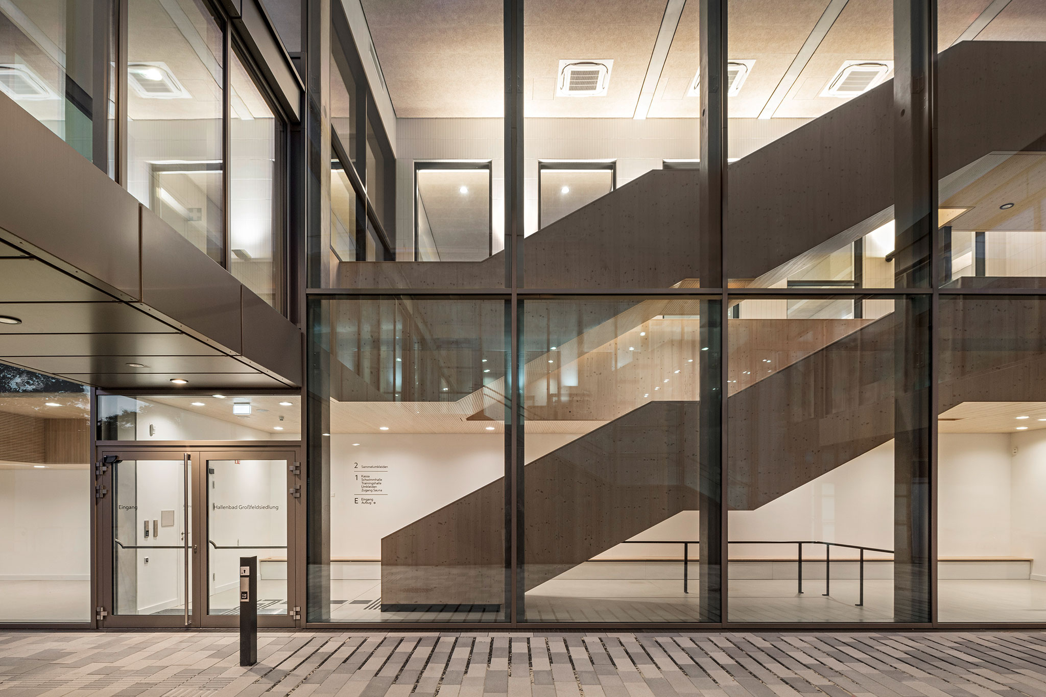 La Piscina pública Großfeldsiedlung planteada por Illiz Architektur, presenta un nuevo edificio independiente de tres plantas que se conecta al complejo existente mediante dos puentes voladizos. Una escalera asciende hasta la primera planta y los dos puentes entrelazan el nuevo vestíbulo con el edificio existente. En una de sus fachadas, se extiende un frente acristalado de doble altura que da paso al ingreso de luz natural hacia la circulación de todo el edificio y sus espacios, como zonas de espera y salas de piscina.