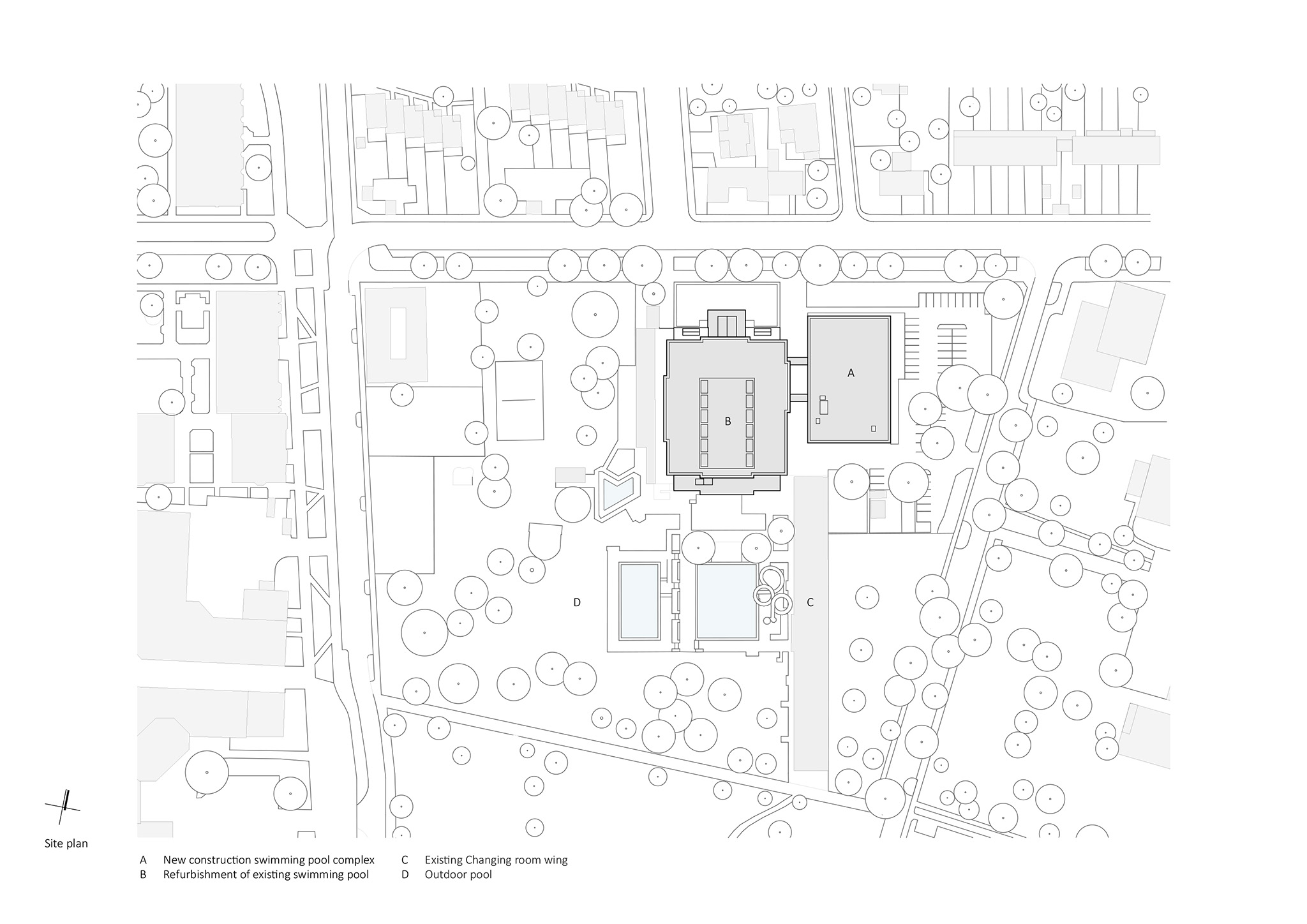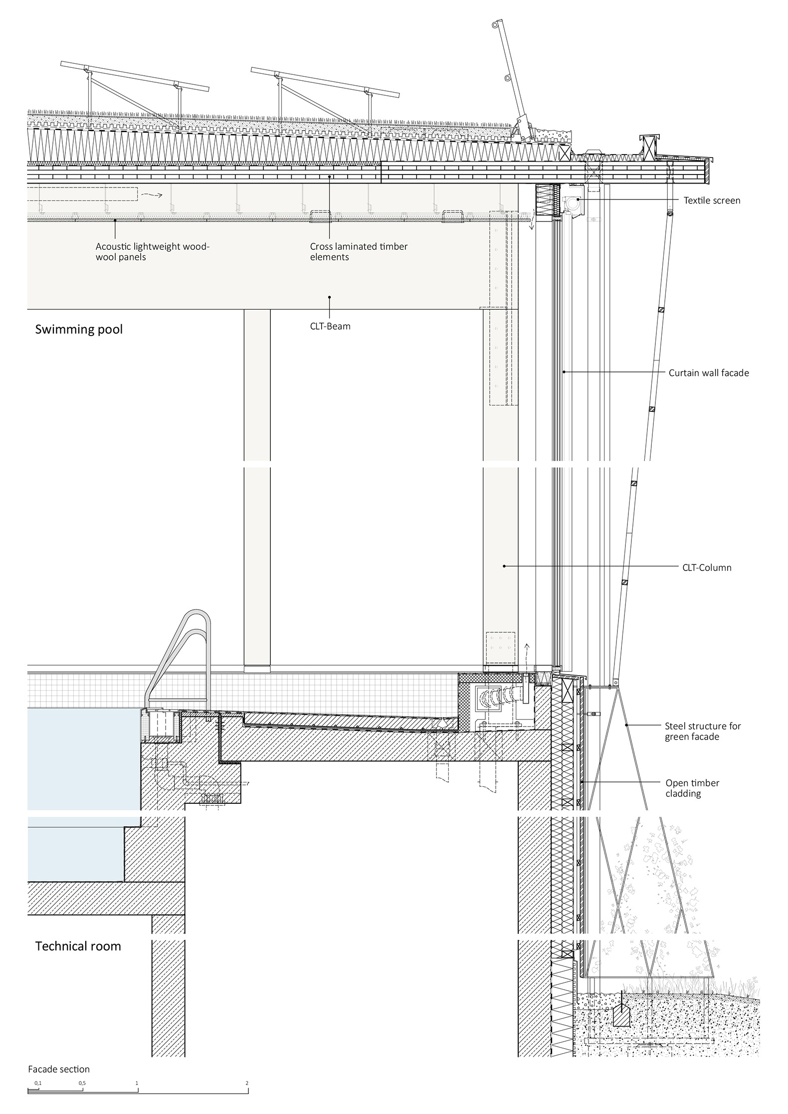 La piscina, de 6 metros de altura, se materializa con una estructura de madera. La pasarela junto a la piscina utiliza azulejos compuestos en tonos neutros blanco y gris claro combinados con madera clara. El edificio cuenta con una losa de madera en voladizo, una serie de claraboyas, y una estructura de acero en la parte delantera que se extiende hacia la cubierta y envuelve la nueva sala de entrenamiento.