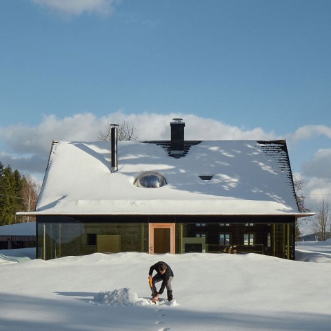 A la luz del sol brilla como un mármol. De frente, una cabina discreta, una de las últimas antes de llegar a Jizerka. Pero el otro lado del edificio revela que aquí ha ocurrido algo extraordinario. Detrás de la cortina de la cabaña original, ha surgido una reluciente extensión de cristal y la casa está preparada para el siguiente acto de su obra.