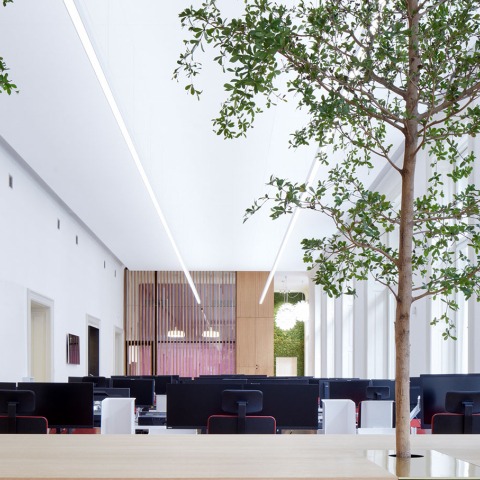 En el segundo punto, observamos el espacio de la oficina en sí, las características particulares del espacio de trabajo y la diversidad de entornos de trabajo. Todos los espacios de trabajo están equipados con mesas ergonómicas ajustables. Todo el espacio abierto está iluminado por sutiles perfiles de luz controlados por un sistema inteligente con la capacidad de variar el grado de rayos directos e indirectos de la luz. La acústica adecuada se consigue mediante paneles de techo suspendidos. El entorno se completa con paredes verdes y vegetación que crecen directamente a partir de una mesa de parquet de madera de cuatro metros de largo. Para una reunión breve, cada empleado puede usar puntos de reunión tapizados montados en las paredes del pasillo principal. Las llamadas telefónicas se pueden hacer en una cabina telefónica al igual que las reuniones cortas, el espacio de vidrio con objetos cubiertos de acero incrustado en la abertura de la puerta anterior genera un buen espacio. Además, hay varias salas de reuniones más pequeñas en toda el área.
