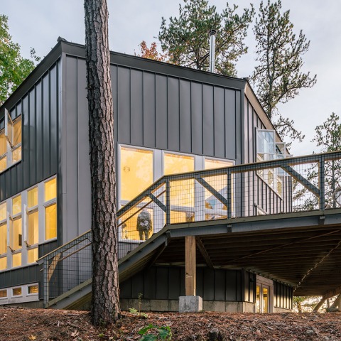 Ubicado en una península en Ossipee Lake, New Hampshire, la cabaña de 280 m² está formada por dos prismas unidos que proporcionan una solución elegante y singular a una amplia gama de deseos y preocupaciones. Entre estas inquietudes se encuentran las respuestas climáticas pasivas, la adaptabilidad para la vida multigeneracional y la deferencia hacia los alrededores espectaculares, que incluyen el lago, los bosques y las White Mountains.