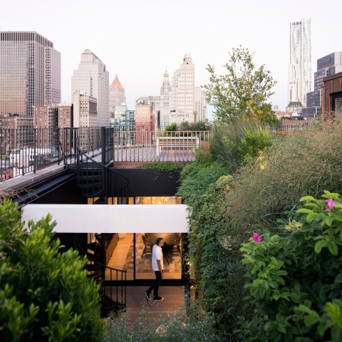 La residencia Gerken ocupa una superficie de 6,000 sf interiores y 1,500 sf exteriores y se sitúa en las plantas 13 y 14 de un edificio histórico de Tribeca, un barrio residencial de Manhattan. La propuesta explora las relaciones cambiantes entre lleno y vacío a través de la interacción de tres prismas. A la entrada, un enorme patio se abre al cielo y la ciudad. Posteriormente se revela que este patio se prolonga hasta la planta 14, conectando los lados este y oeste de la vivienda y ambas plantas en sección. Este patio también resalta el núcleo central del edificio como una masa monolítica. El núcleo está revestido de unos paneles de yeso hechos a medida a través de una técnica de siglos de antigüedad unida a un lenguaje de diseño digital contemporáneo.