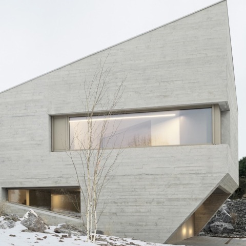 Un convencional techo a dos aguas y el terreno levemente ascendente refuerzan el efecto angular y escultural de la casa, que se encuentra diseñada sobre una planta hexagonal. Al ingresar en la vivienda, a través de su acceso cortado en el volumen de hormigón, se llega primero a la sala jardín. Desde aquí, una escalera de un tramo conduce hasta el nivel residencial. La zona de entrada, muy estrecha y alta, se transforma en un espacio que se abre hacia arriba que está claramente delimitado por los múltiples pliegues de la forma del techo: a medida que uno circula por la casa, la constricción y la expansión, lo cerrado y lo abierto entran en un diálogo emocionante y en constante cambio. Las aberturas de las ventanas situadas horizontalmente en la envolvente de hormigón de 50 cm de espesor crean una vista enmarcada del paisaje circundante.