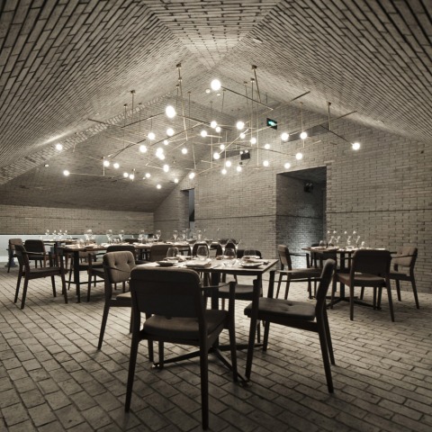 A través de la columnata a ambos lados de la sala principal, una serie de pequeños espacios de capilla se ramifican, contiene la recepción, Salón de fumar, cocina, terraza al aire libre y un comedor privado. Pasando a través de umbrales oscuros y pesados, se descubren estas habitaciones únicas, cada una con reinterpretaciones originales de pinturas del Renacimiento clásico en las paredes, de Caravaggio a Tiziano. El claroscuro de la pincelada pintado encuentra resonancia en el contraste de experiencias espaciales, desde un pasillo estrecho vestido sólo con ladrillo a un alto nicho abovedado alisado con yeso blanco. El drama del viaje espacial es sólo comparable con el espectáculo de los cocineros preparando la comida en sí, como se vislumbra a través de varias vistas enmarcadas de la demostración de cocina. Es un espacio que está destinado a ser consumido, como la mordida perfecta de comida que le trae de vuelta a lo que es a la vez familiar y estimulante.