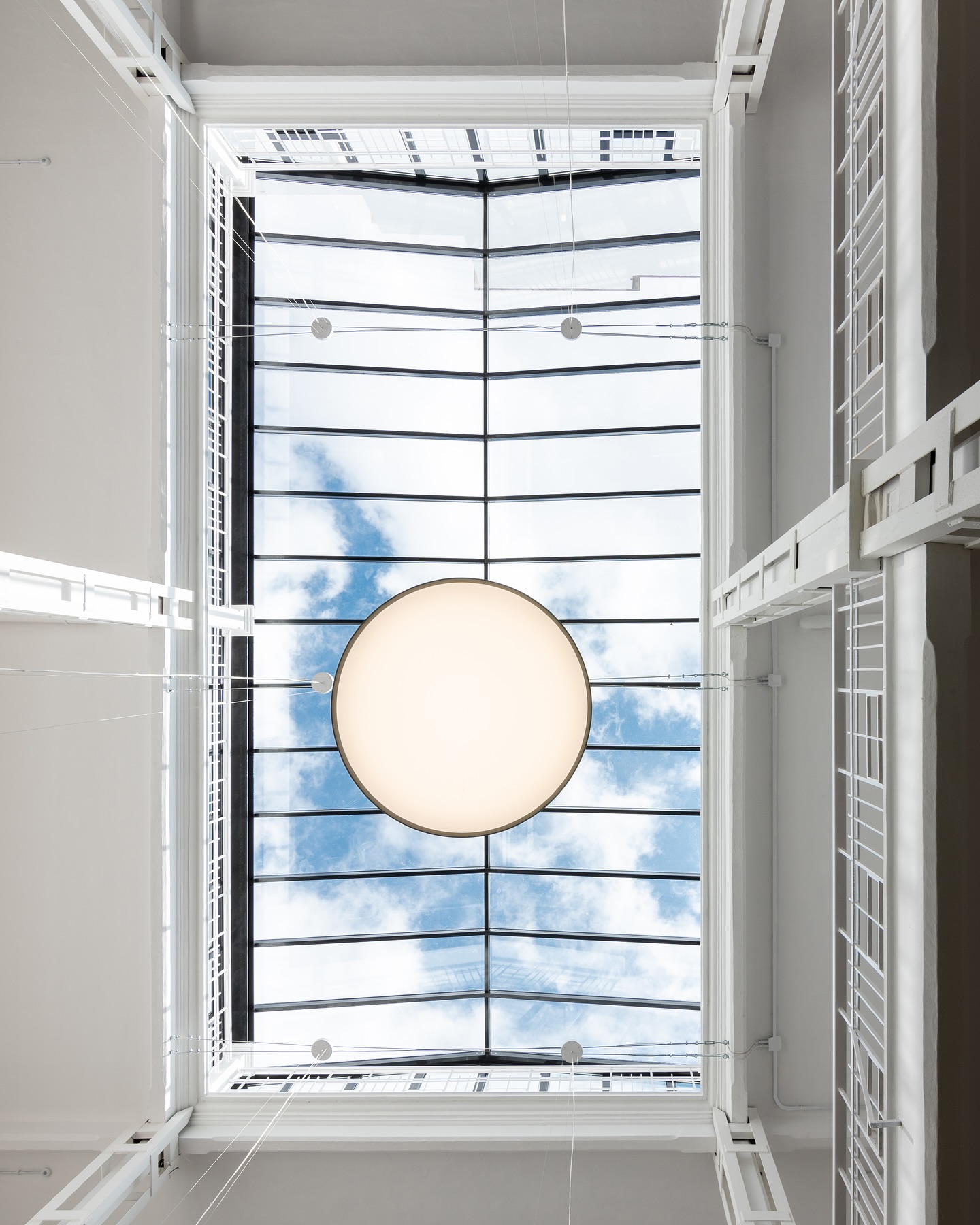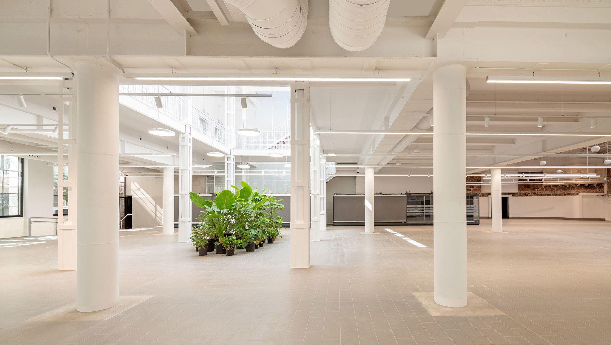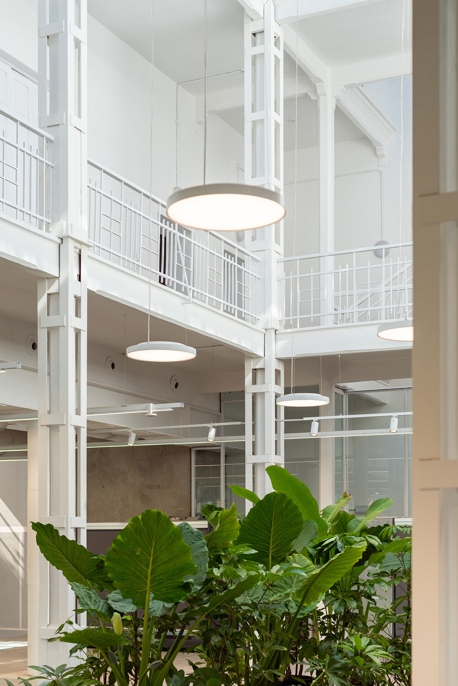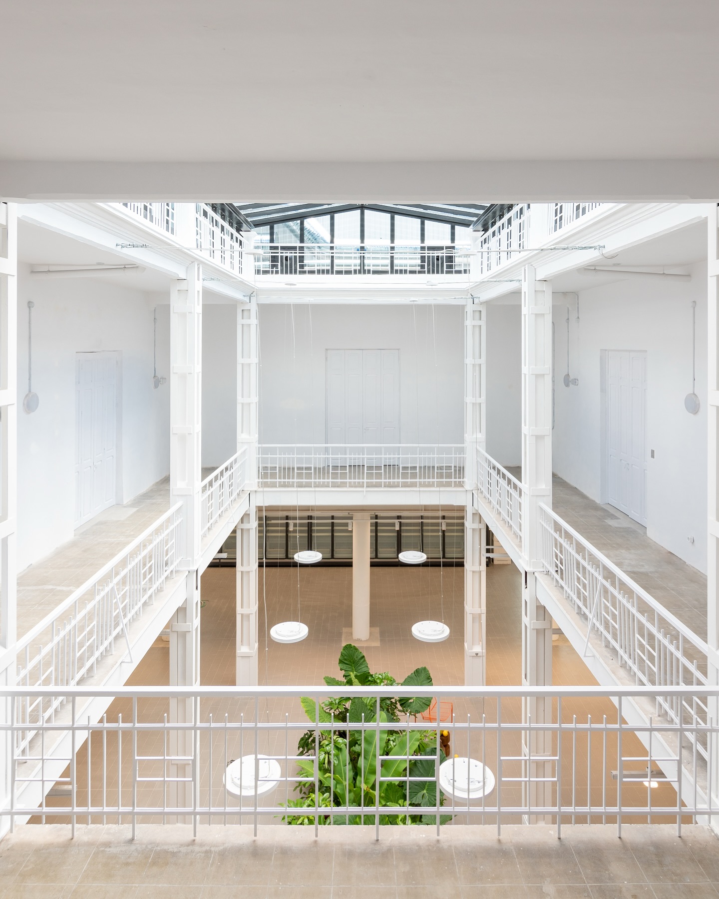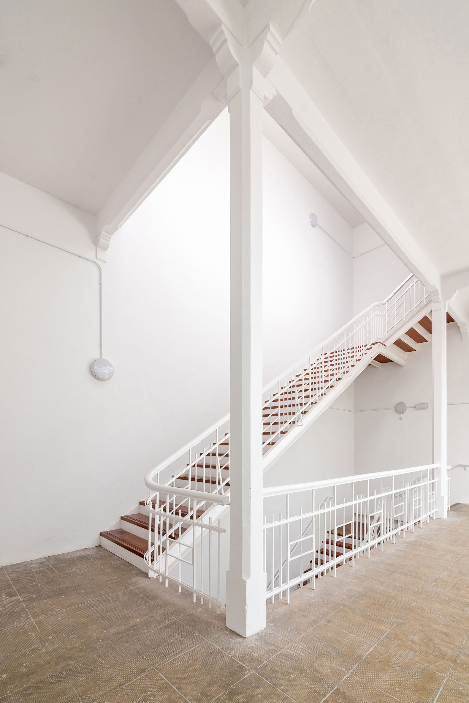Se hace uso del atrio de la antigua fábrica, que actuaba como espacio distribuidor y como entrada de luz, recuperando esta cualidad para el proyecto. Para ello, se conservan la escalera de fundición y las carpinterías de madera que se encontraban dentro de este espacio. Sin embargo, los muros de mampostería que servían como apoyo estructural en planta baja alrededor del atrio han sido eliminados para su conservación. Para resolver esta renovación estructural, se ejecutaron vigas de 10,5 metros de luz, utilizando dos vigas HEB-550.
