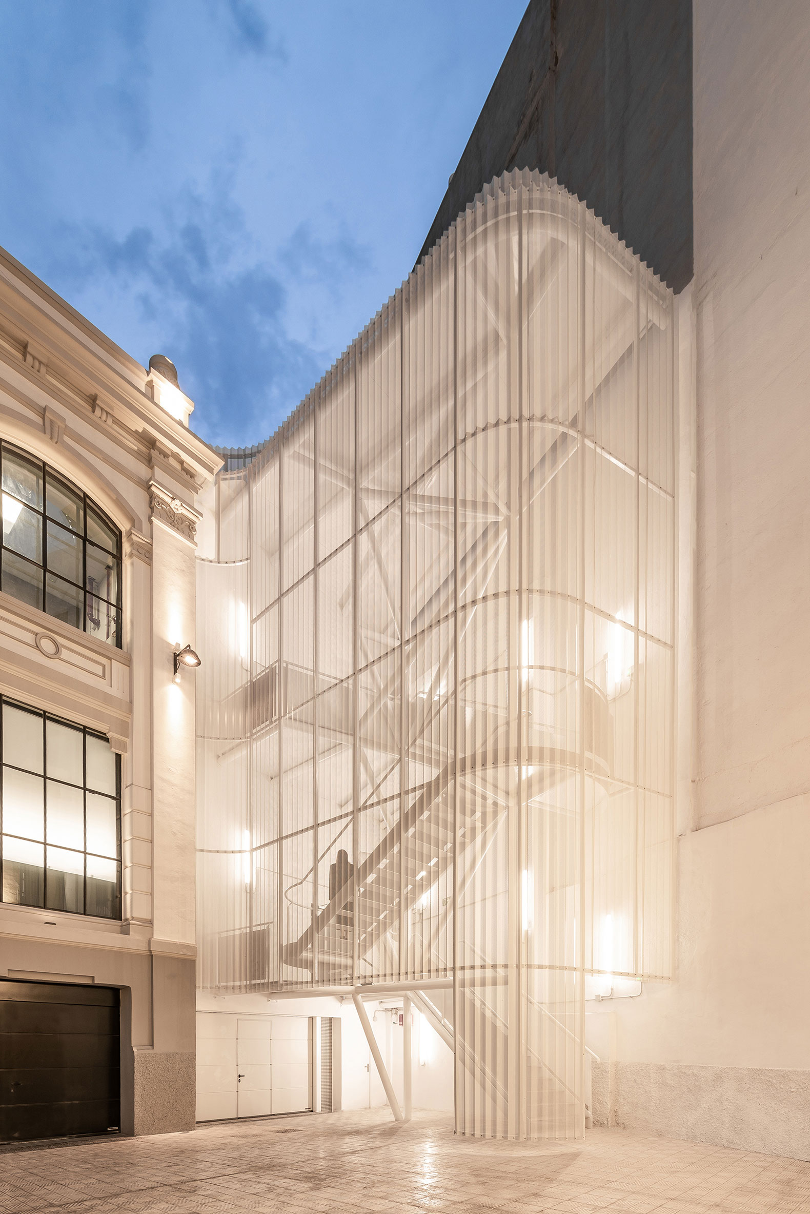Junto a la fachada histórica de la fábrica aparece un nuevo elemento vertical que es la escalera de evacuación, fabricada mediante perfiles tubulares de acero, se reviste con una piel semitransparente a modo de velo, de forma que, por contraste y por texturas, no compite con el edificio catalogado, sino que establece una relación de armonía entre las arquitecturas del pasado y las actuales. Un inmueble recuperado tras 50 años de abandono La Fábrica de Tabacos cerró sus puertas en 1975 y el Cinema Victoria proyectó su última película en 1979.