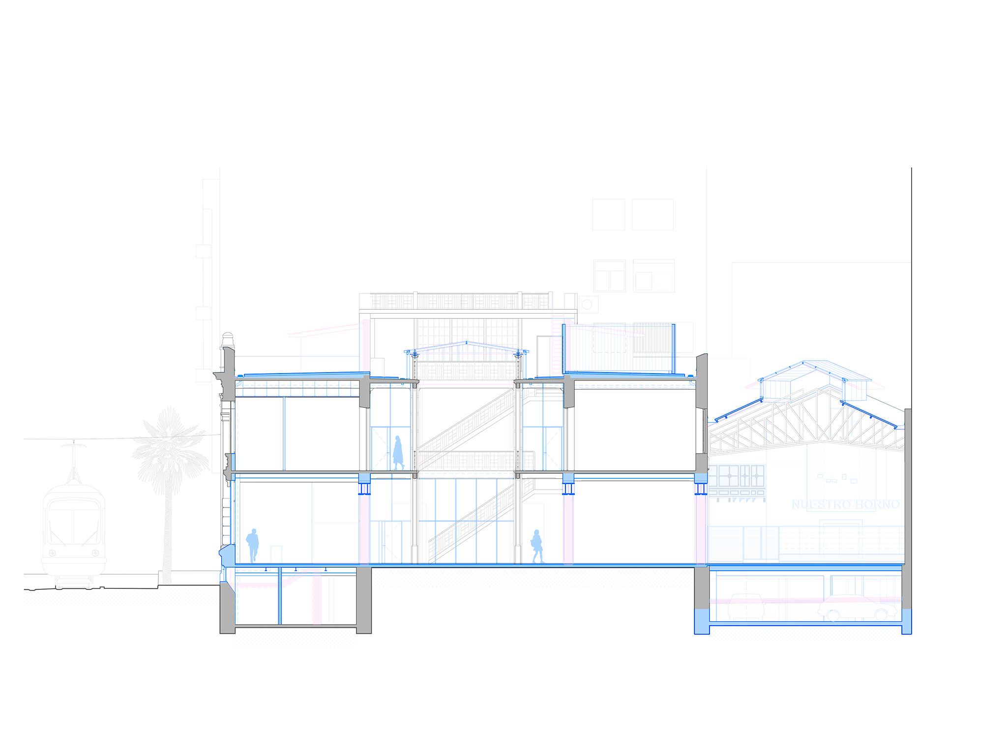 Para acometer esta operación se ejecutaron grandes vigas cargadero de hasta 10,5 m de luz formadas por dobles HEB-550. Las siguientes plantas se mantuvieron en su estado original, por lo que la ejecución supuso un gran reto constructivo en una localización céntrica en la ciudad y plazos muy ajustados. Contenedor y Uso. Las geometrías de la fábrica y del cinema Victoria son los articuladores de los espacios en uso. El edificio no se ha adaptado al uso comercial, sino que ha sido el uso comercial el que se ha adaptado al edificio. Esta afirmación, sencilla a priori, obliga al usuario y promotor a renunciar a ciertas comodidades y funcionalidades en favor de la preservación del inmueble histórico.