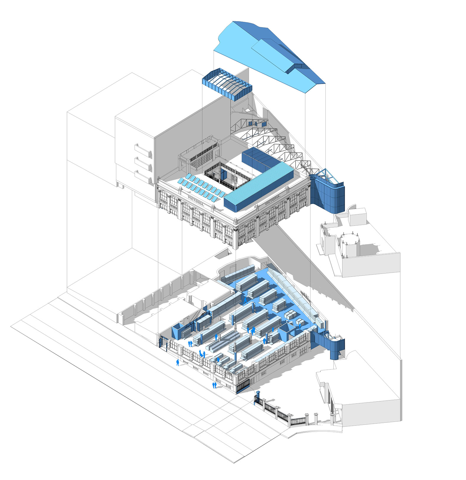 El uso de los antiguos letreros deja clara la intención de los arquitectos de reconstruir la imagen original. El único volumen que se incorpora es la escalera de evacuación, recubierta por un velo semitransparente que busca disimularla para no competir con la fachada histórica.