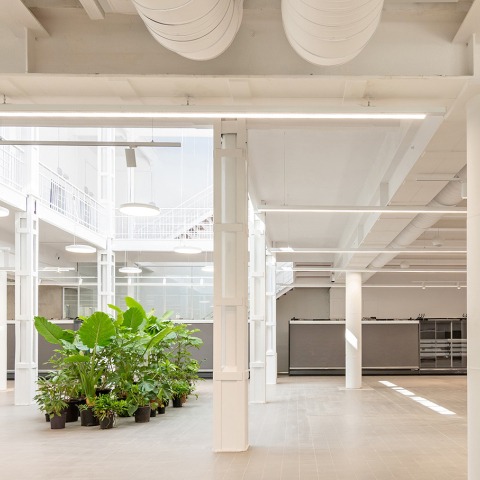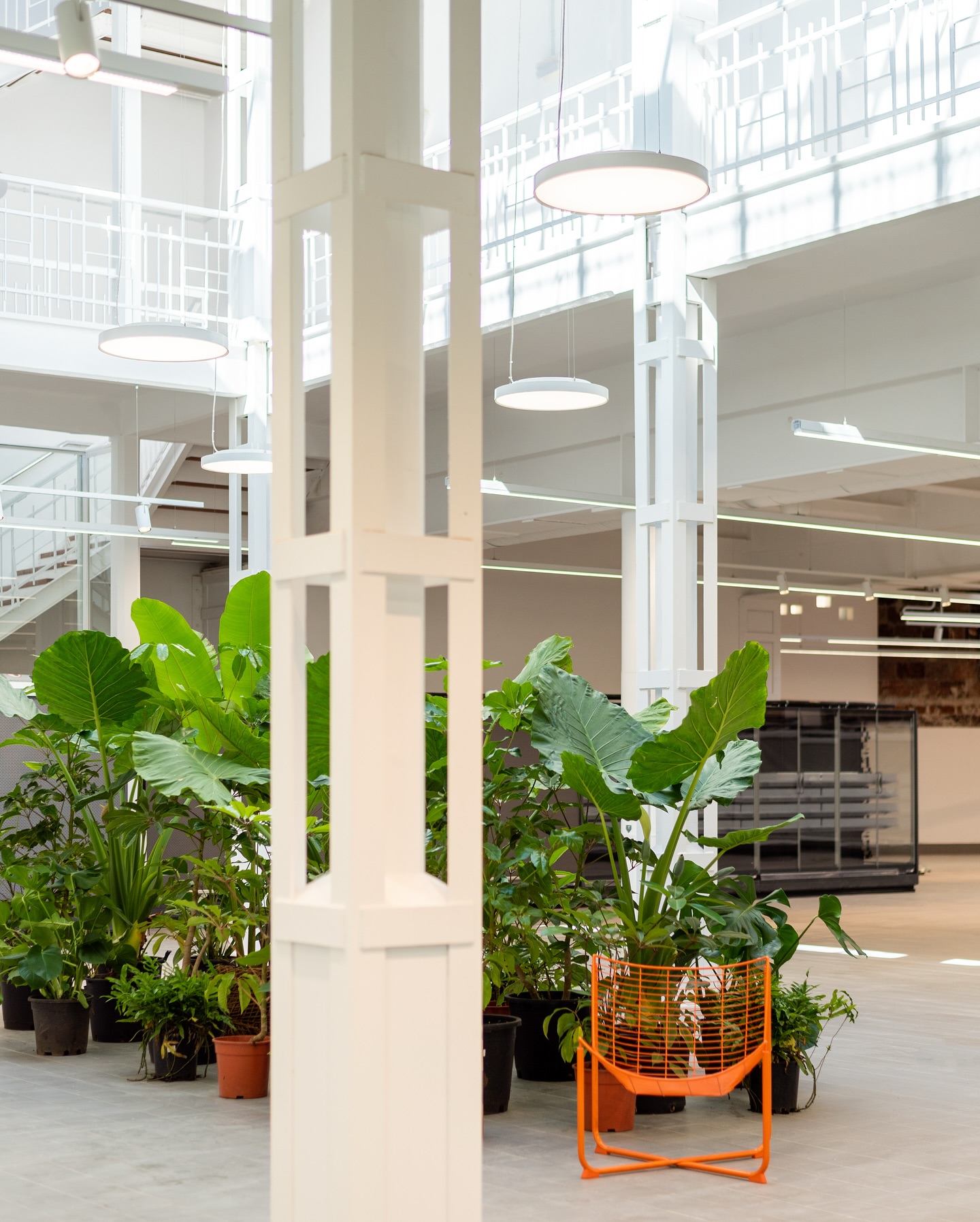 - Se ha restaurado el atrio central de la fábrica en su configuración original y devolviéndole su papel como espacio articulador del conjunto que aporta gran amplitud y luz natural al interior. En este espacio se han conservado las carpinterías de madera y las barandillas de fundición remachadas estilo art decó.