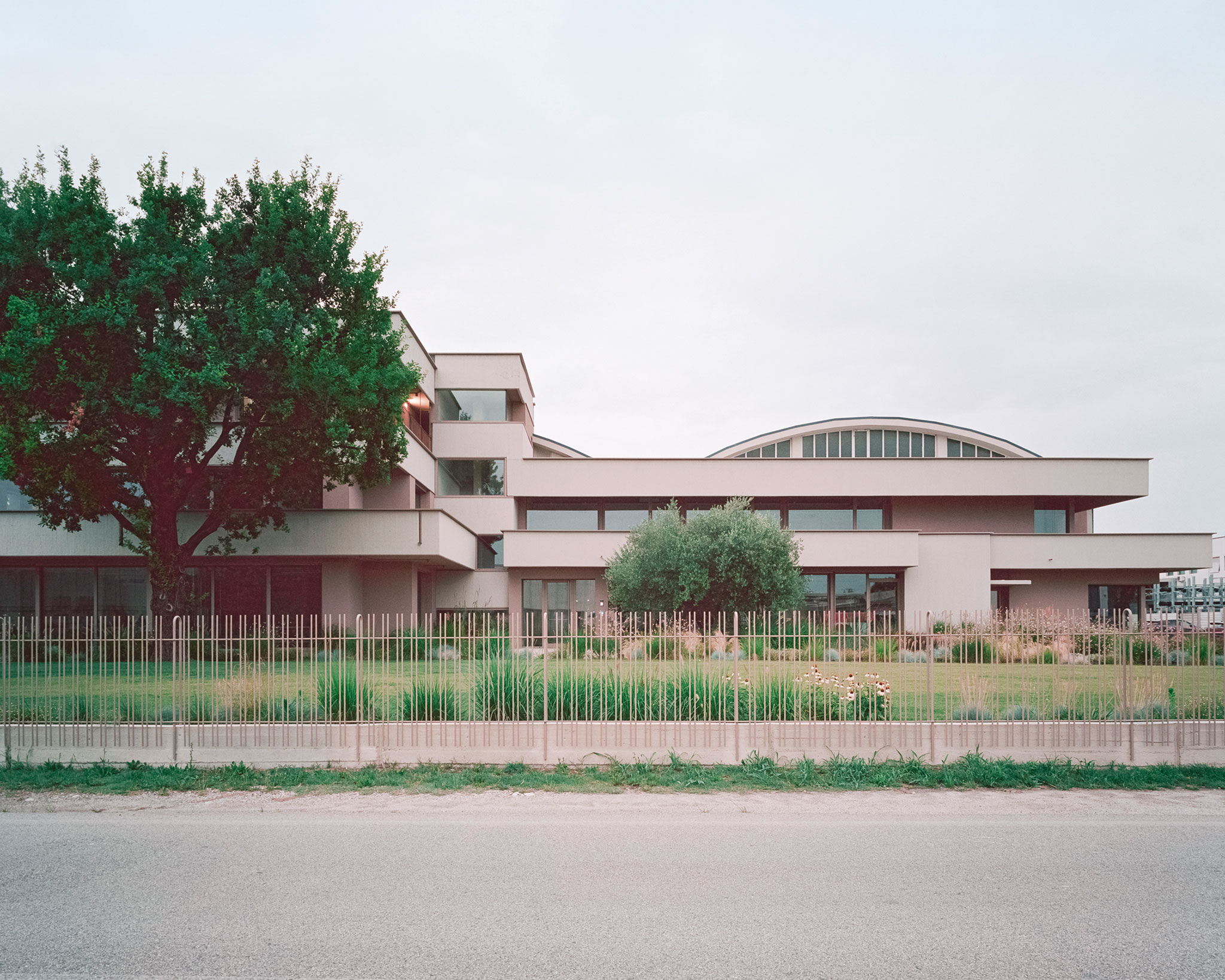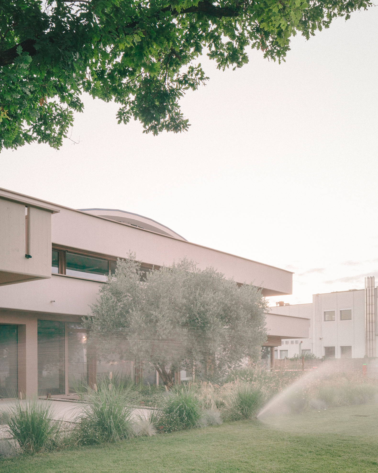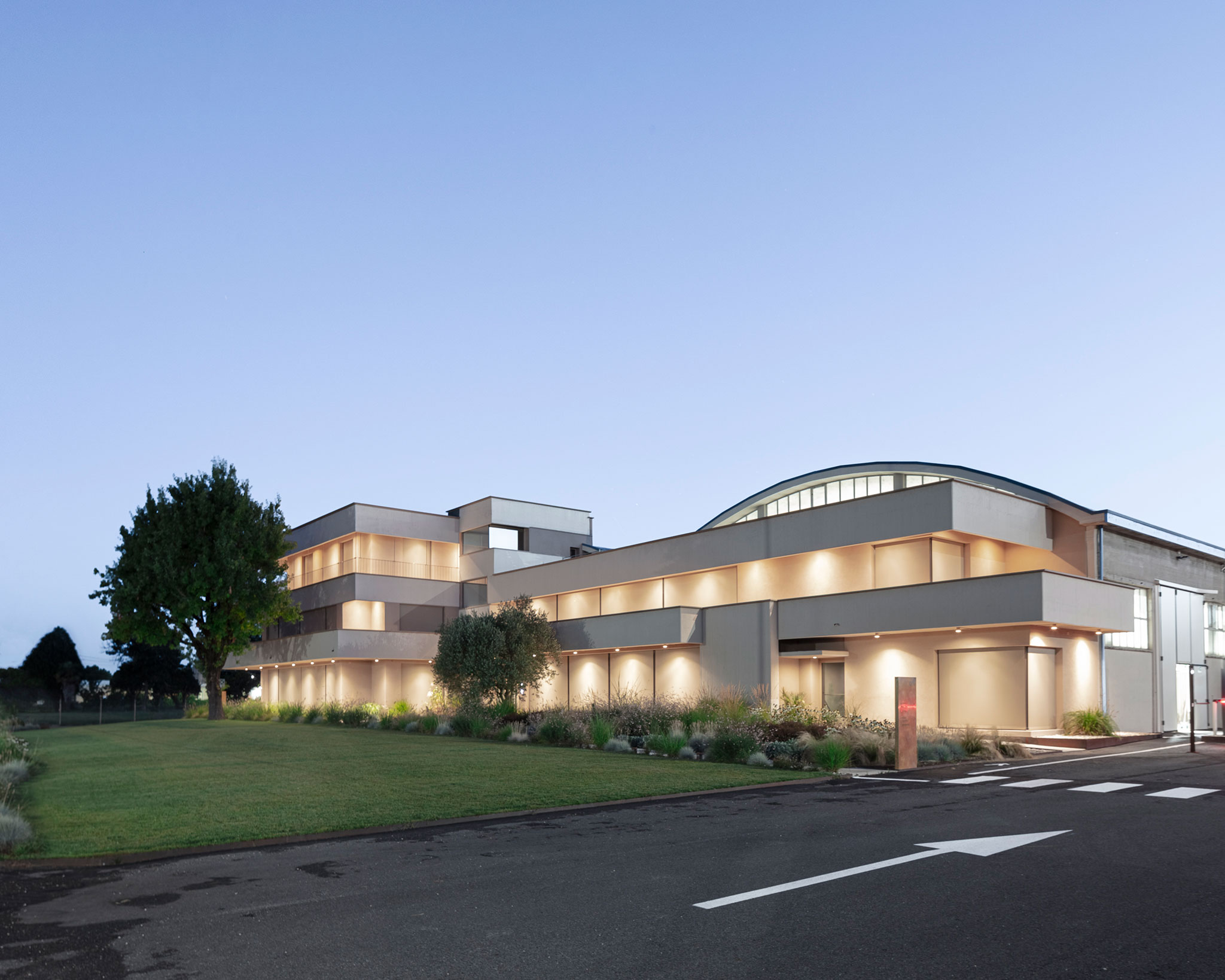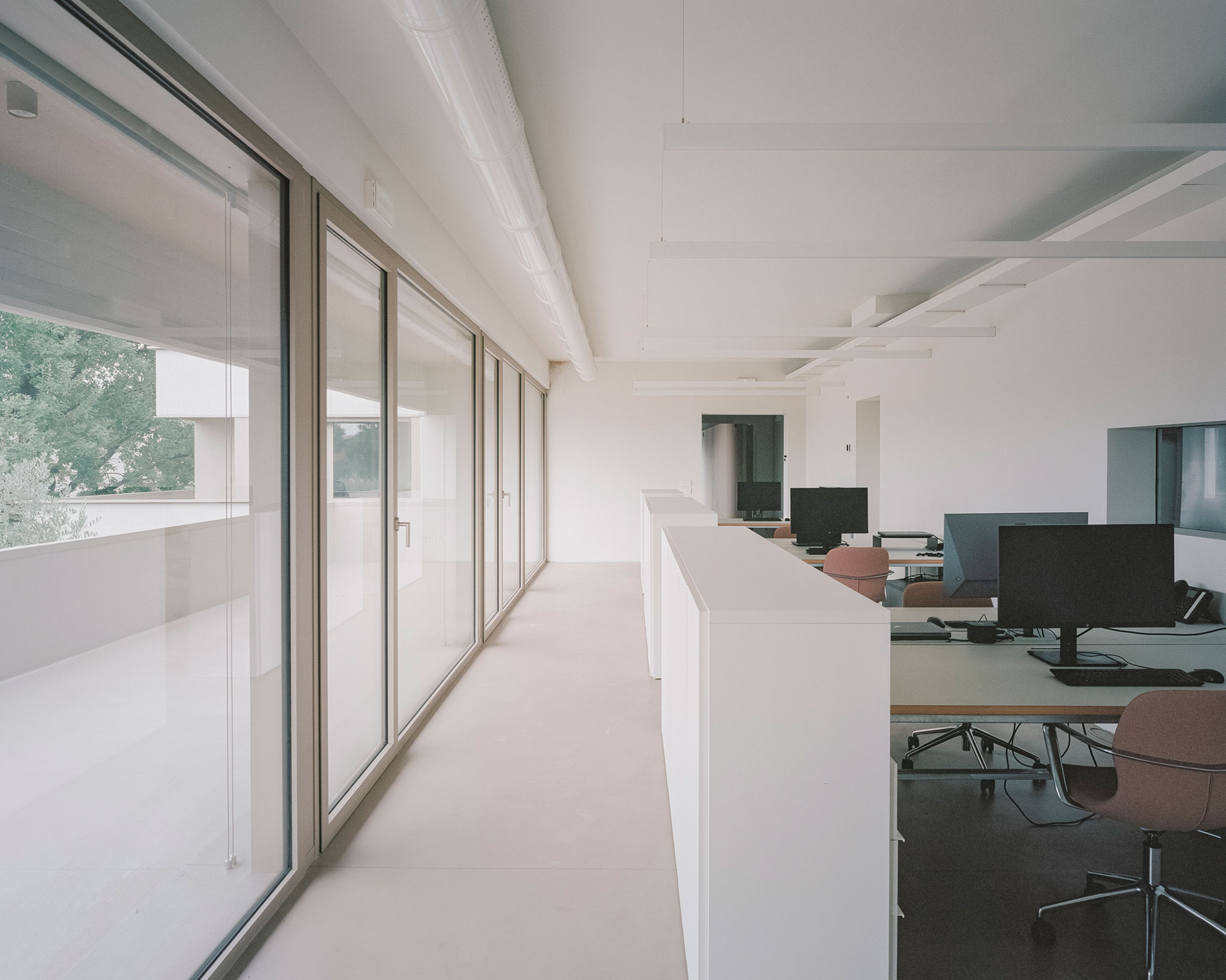 Las intervenciones en el área de oficinas revitalizaron y mejoraron la composición original, garantizando la conformidad sísmica y energética de las estructuras. Se eliminaron todos los tabiques internos no estructurales en favor de espacios fluidos y diáfanos. Las fachadas se rediseñaron con grandes ventanales, en su mayoría continuos, que mejoraron la iluminación natural en los espacios de trabajo y enfatizaron la relación entre los interiores, las terrazas exteriores y el jardín frontal.