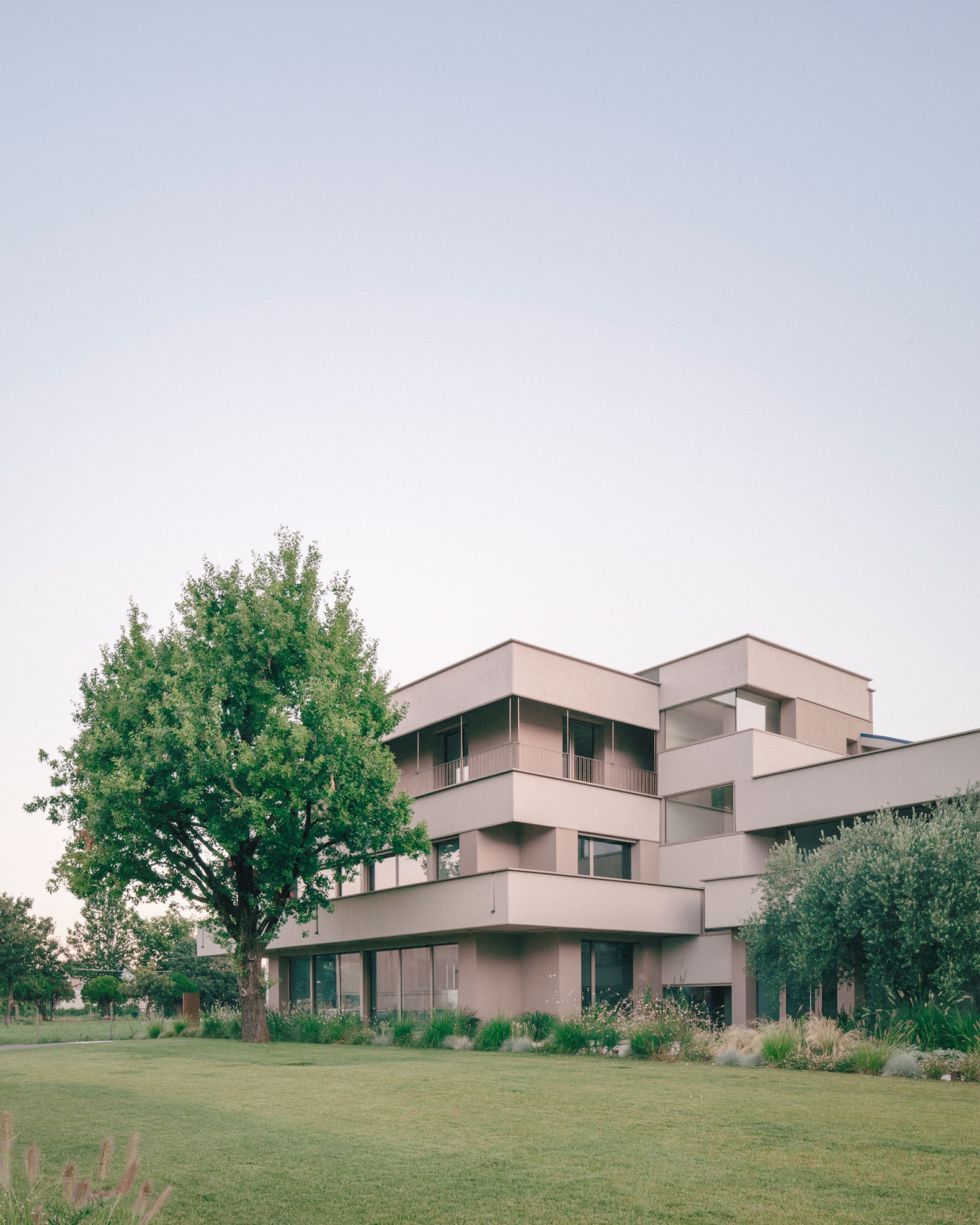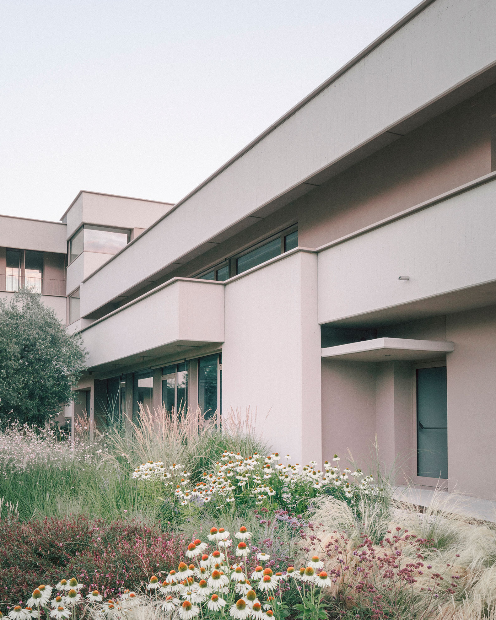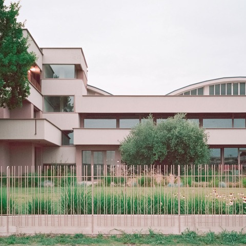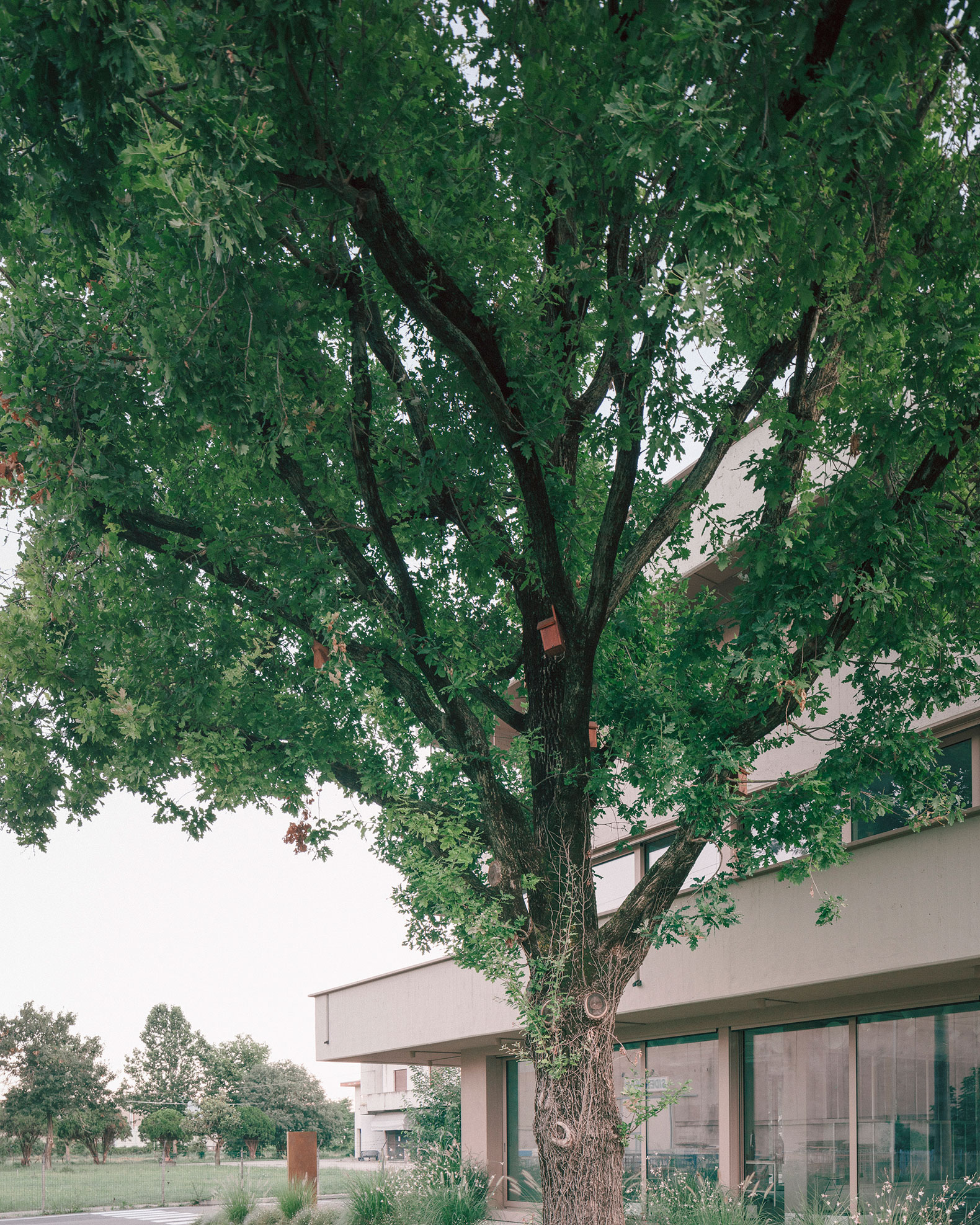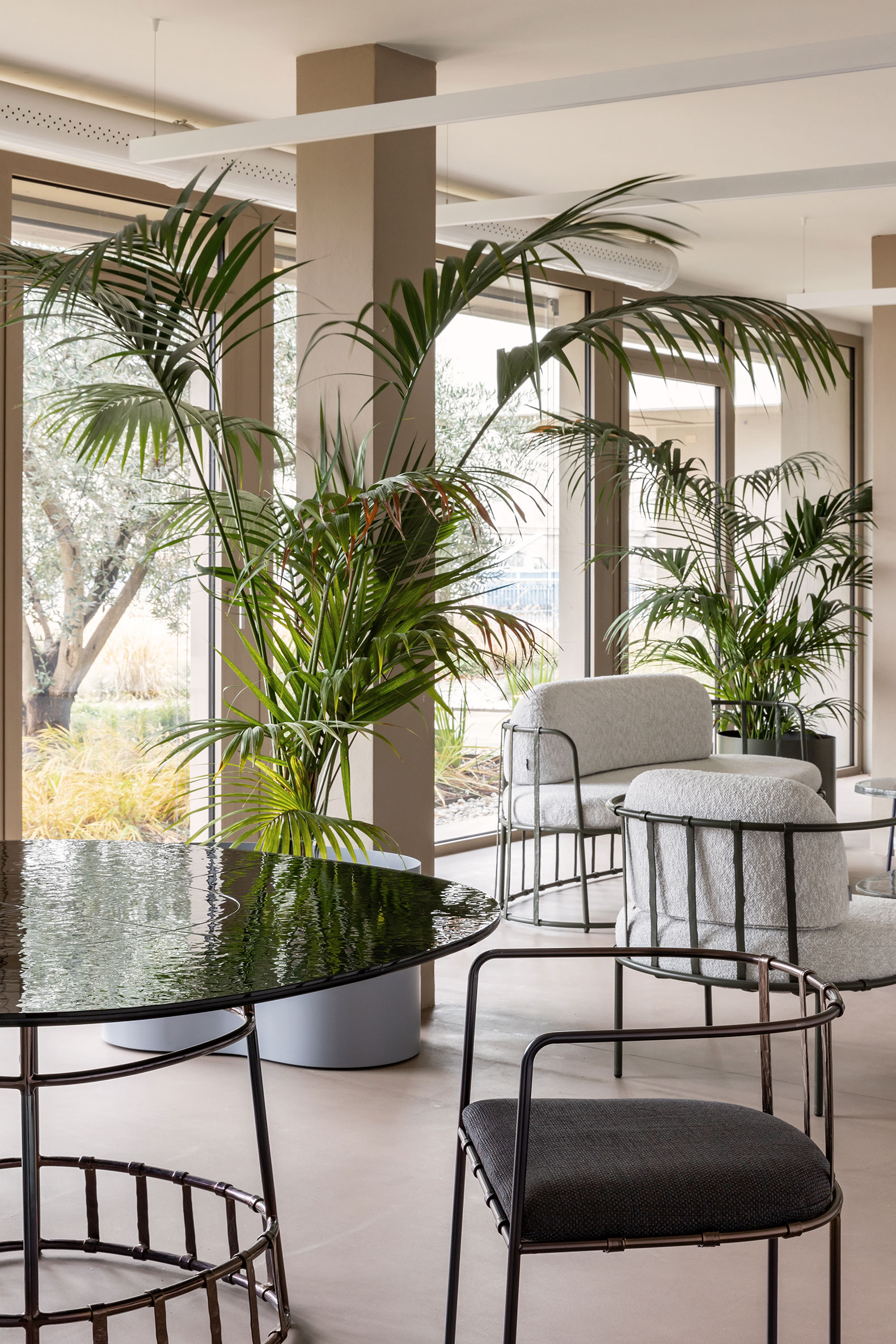 Las intervenciones en el área de oficinas revitalizaron y mejoraron la composición original, garantizando la conformidad sísmica y energética de las estructuras. Se eliminaron todos los tabiques internos no estructurales en favor de espacios fluidos y diáfanos. Las fachadas se rediseñaron con grandes ventanales, en su mayoría continuos, que mejoraron la iluminación natural en los espacios de trabajo y enfatizaron la relación entre los interiores, las terrazas exteriores y el jardín frontal.