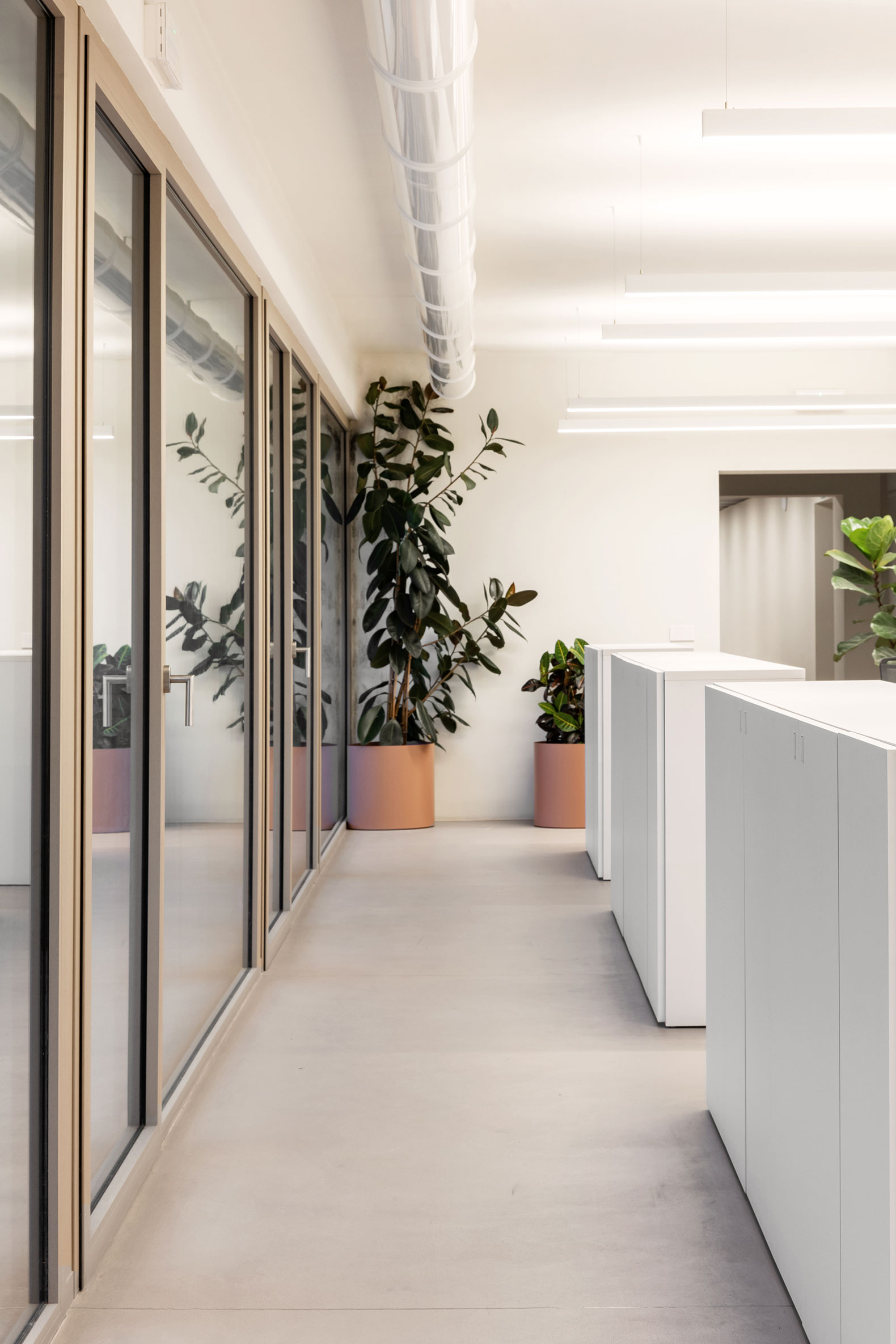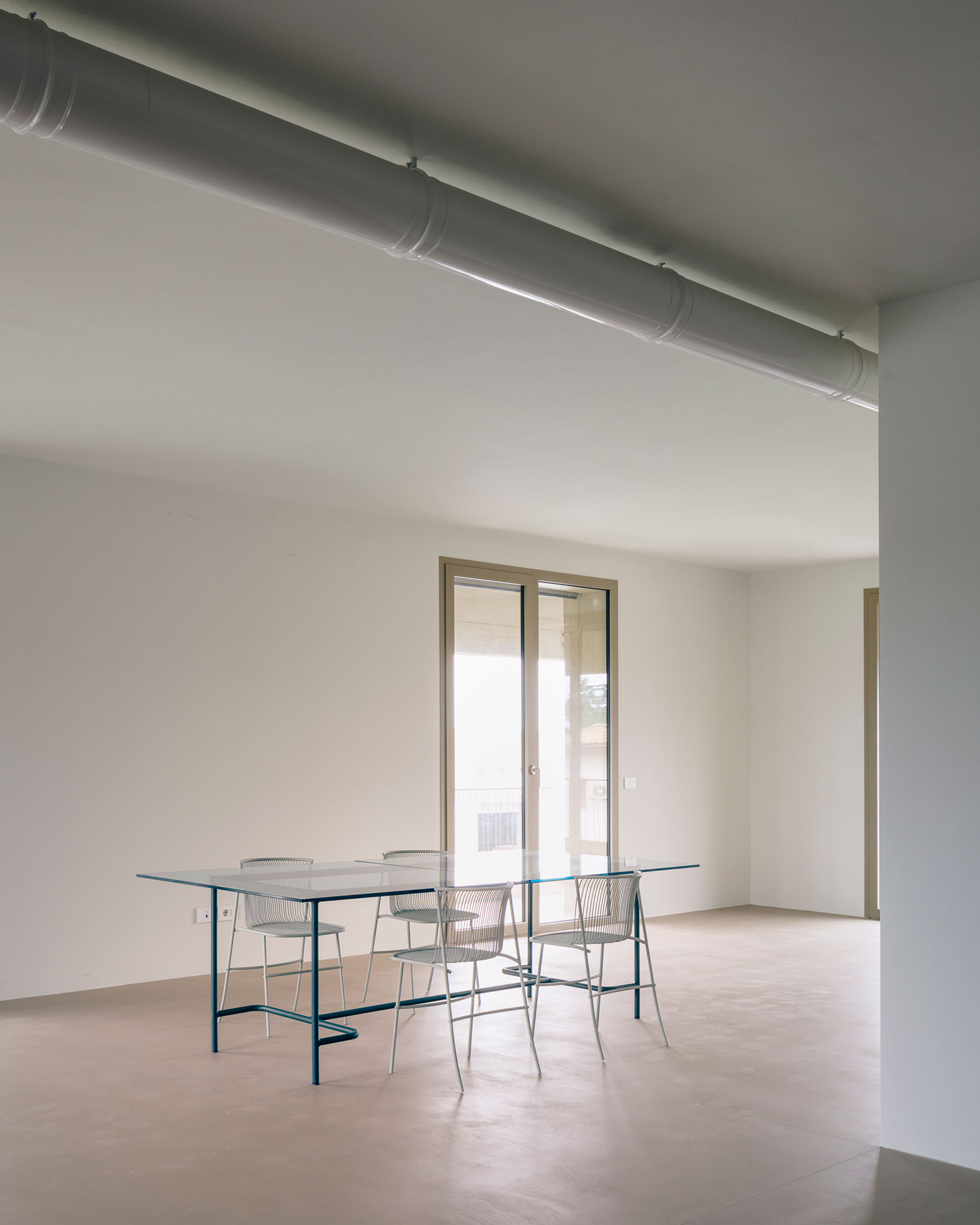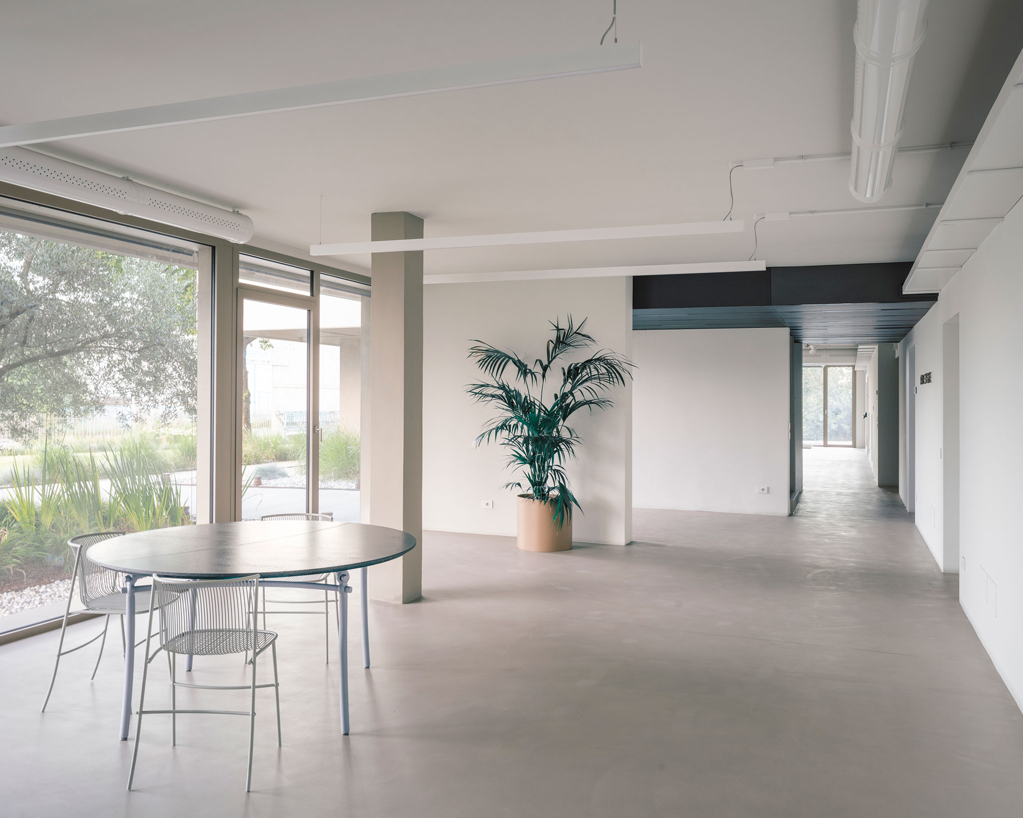El diseño mantiene la configuración general de la estructura, eliminando todas las particiones internas no estructurales para crear un espacio fluido y abierto. Se han añadido grandes aberturas continuas a la fachada, que enfatizan la relación entre el exterior y el interior y mejoran la iluminación natural en los espacios de trabajo.