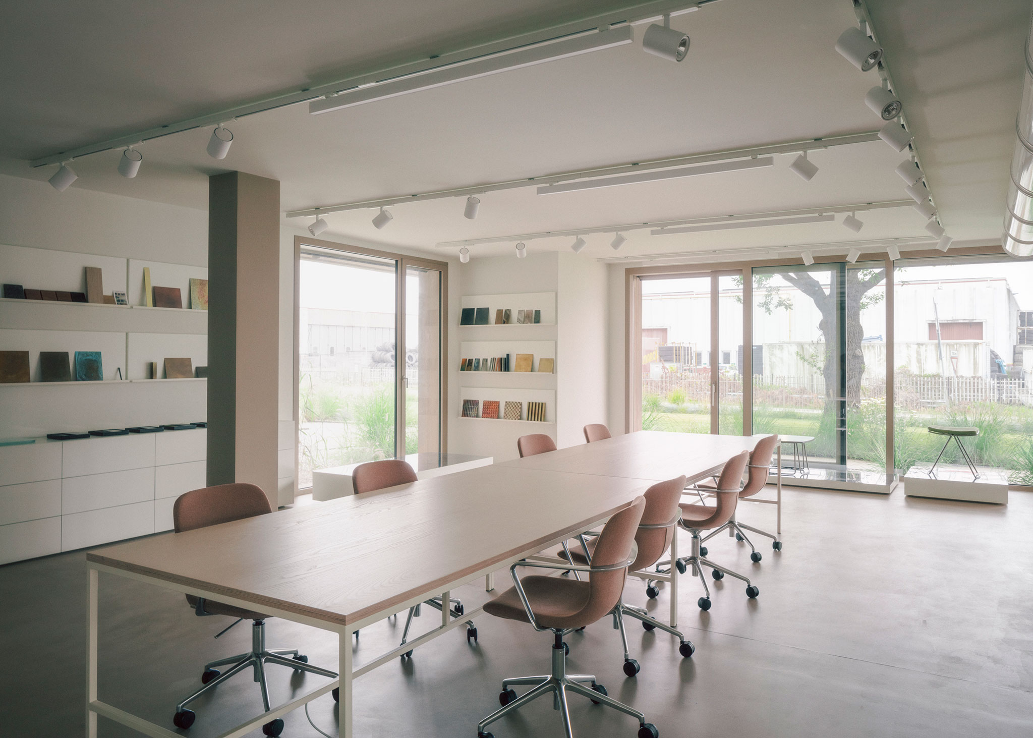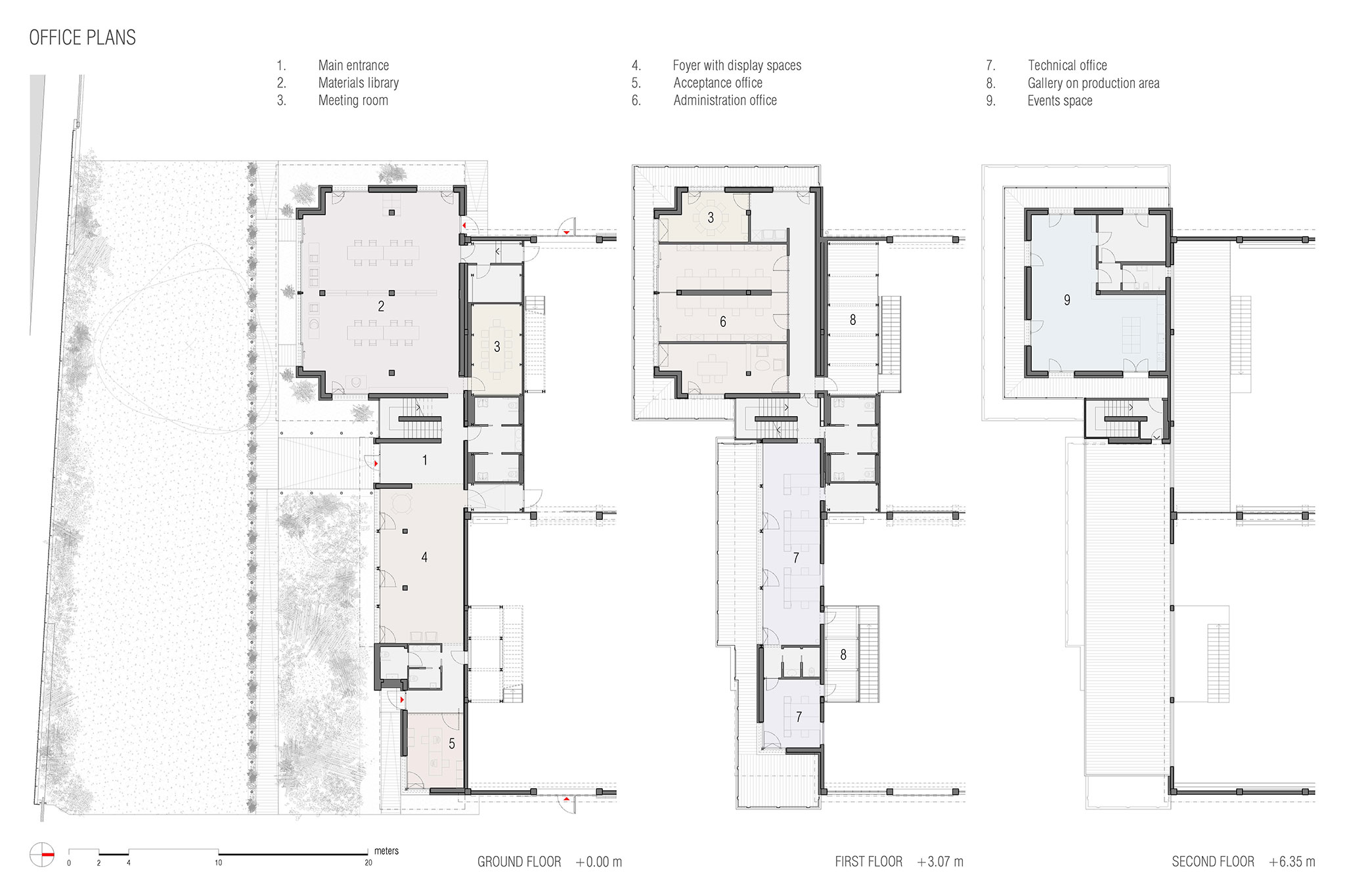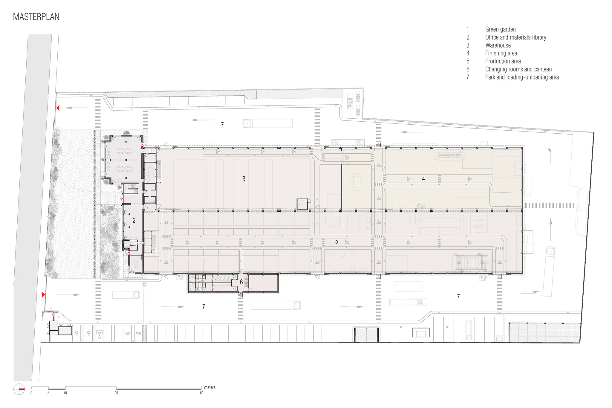 El edificio original constaba de dos partes: en la sección principal, de estilo brutalista, se crearon las oficinas ejecutivas, la biblioteca de materiales y los espacios técnico-administrativos; mientras que en el doble volumen abovedado de 112 m de profundidad, se estableció el área de producción. Se decidió mantener la configuración general de la estructura, adaptando la distribución interior a las nuevas funcionalidades. La nueva distribución de la producción fortaleció la relación funcional entre los espacios interiores y los patios exteriores, optimizando el ciclo de transformación de las materias primas, que llegan por la puerta este y emergen como productos terminados por la puerta oeste.