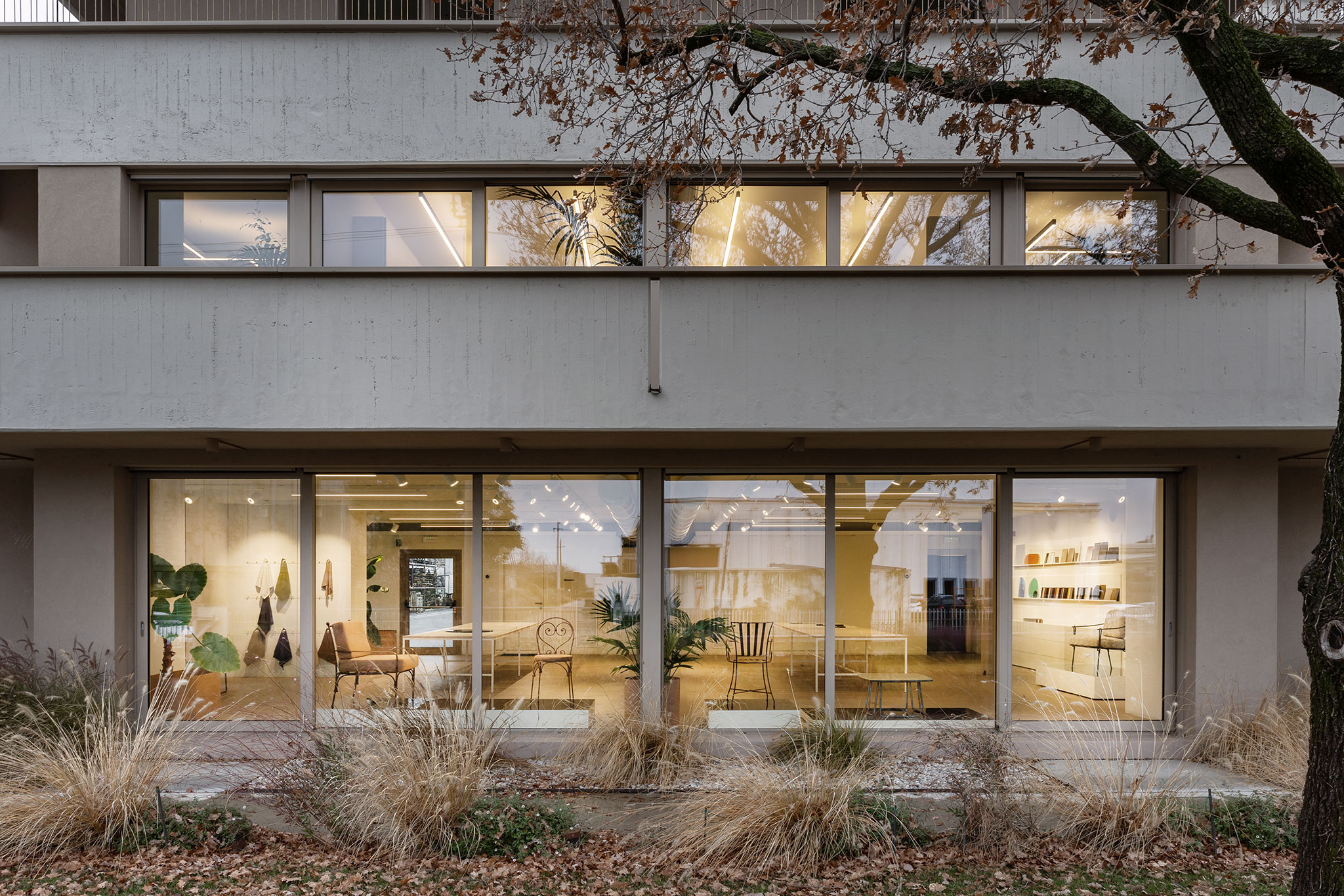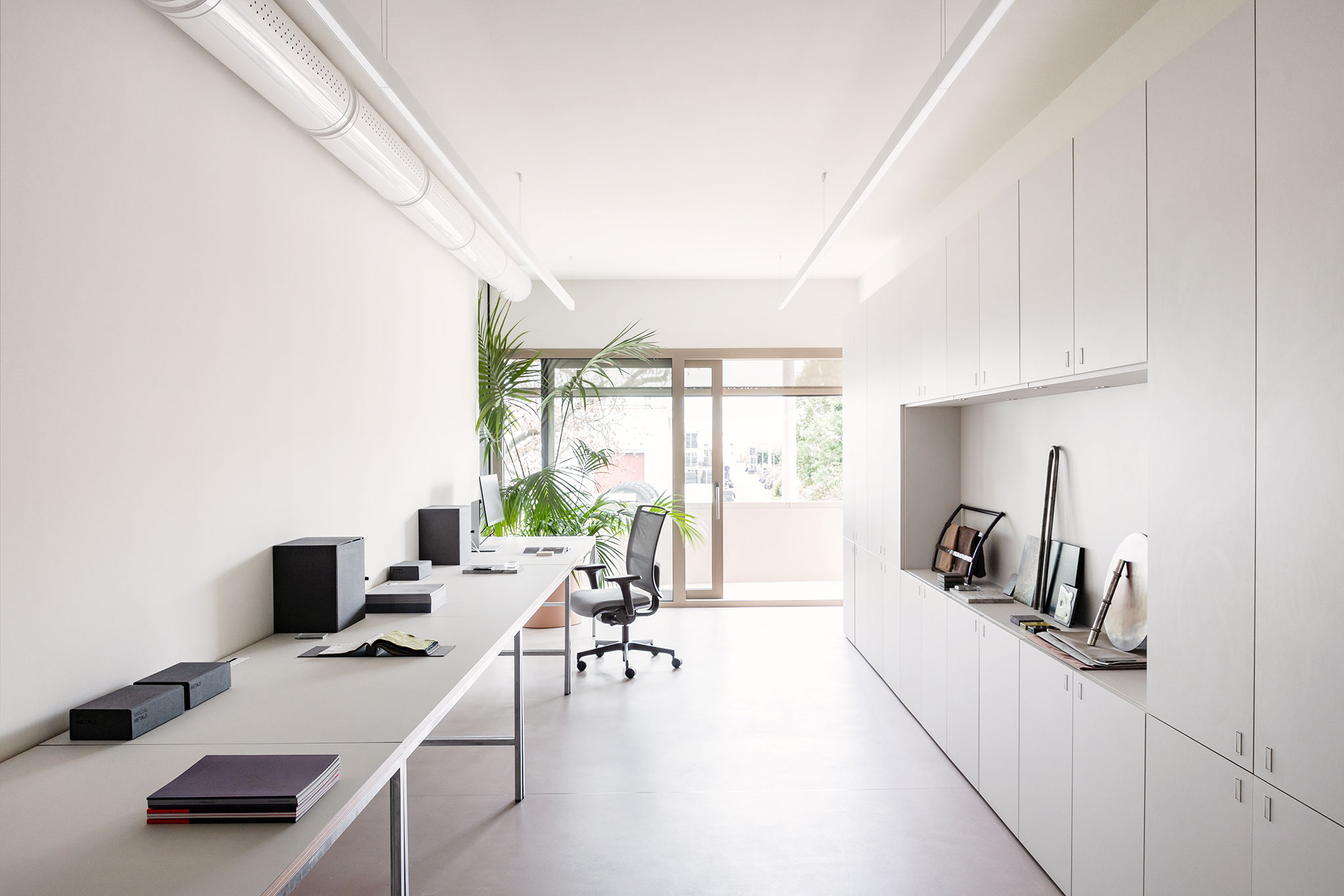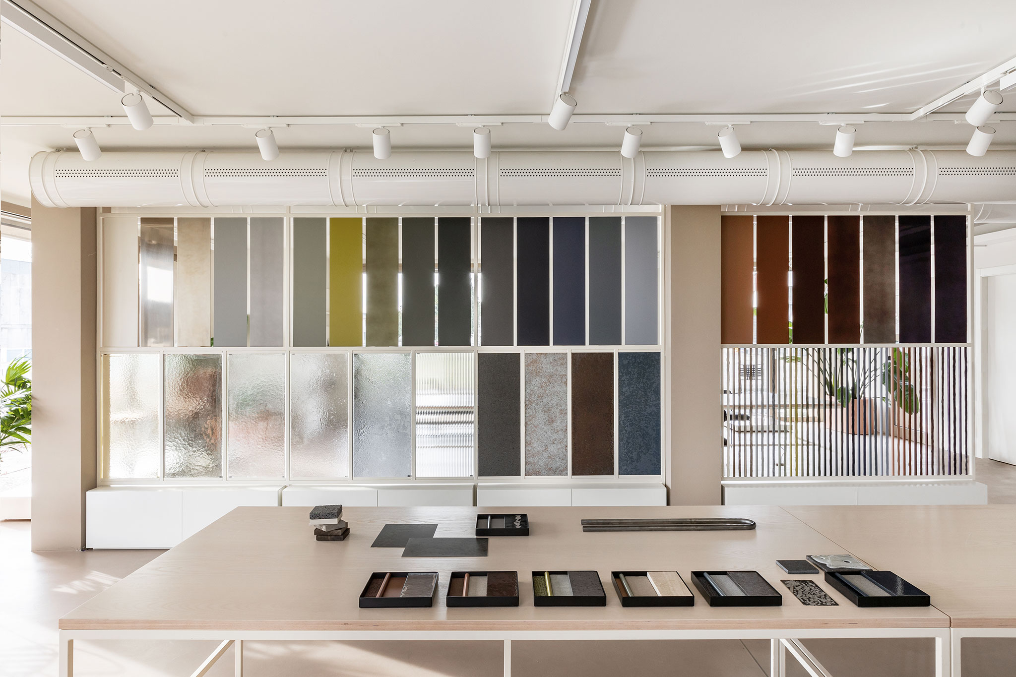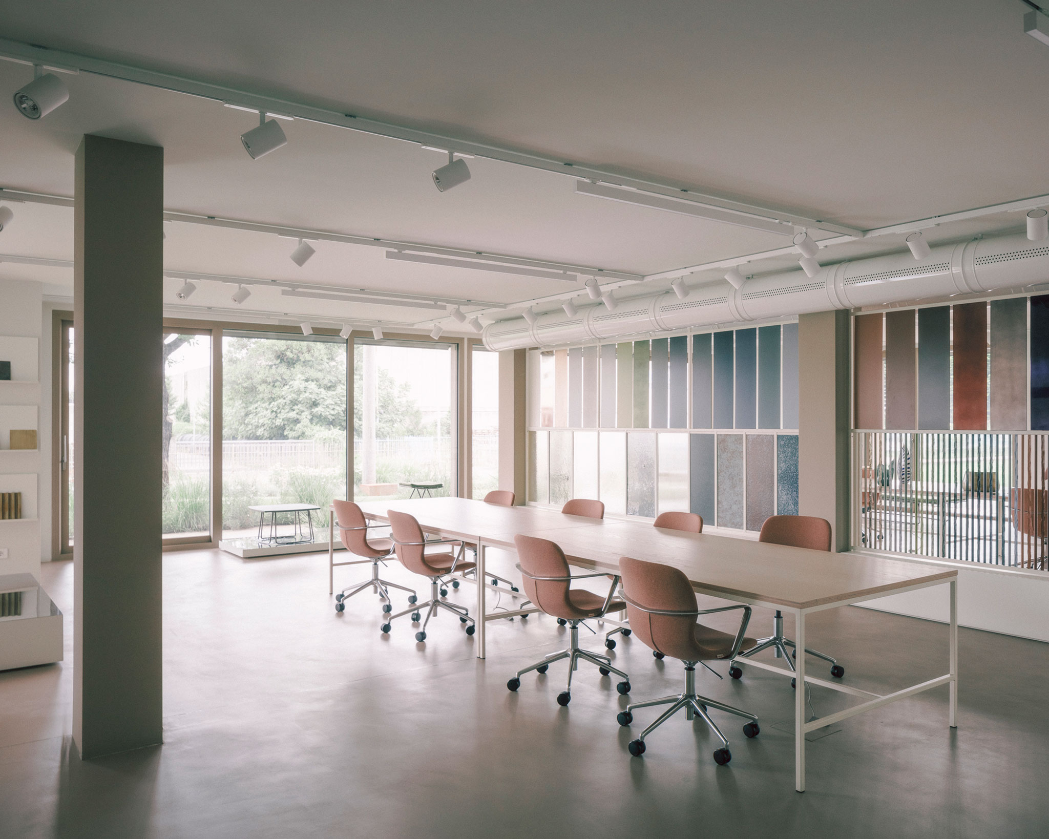 El edificio original constaba de dos partes: en la sección principal, de estilo brutalista, se crearon las oficinas ejecutivas, la biblioteca de materiales y los espacios técnico-administrativos; mientras que en el doble volumen abovedado de 112 m de profundidad, se estableció el área de producción. Se decidió mantener la configuración general de la estructura, adaptando la distribución interior a las nuevas funcionalidades. La nueva distribución de la producción fortaleció la relación funcional entre los espacios interiores y los patios exteriores, optimizando el ciclo de transformación de las materias primas, que llegan por la puerta este y emergen como productos terminados por la puerta oeste.