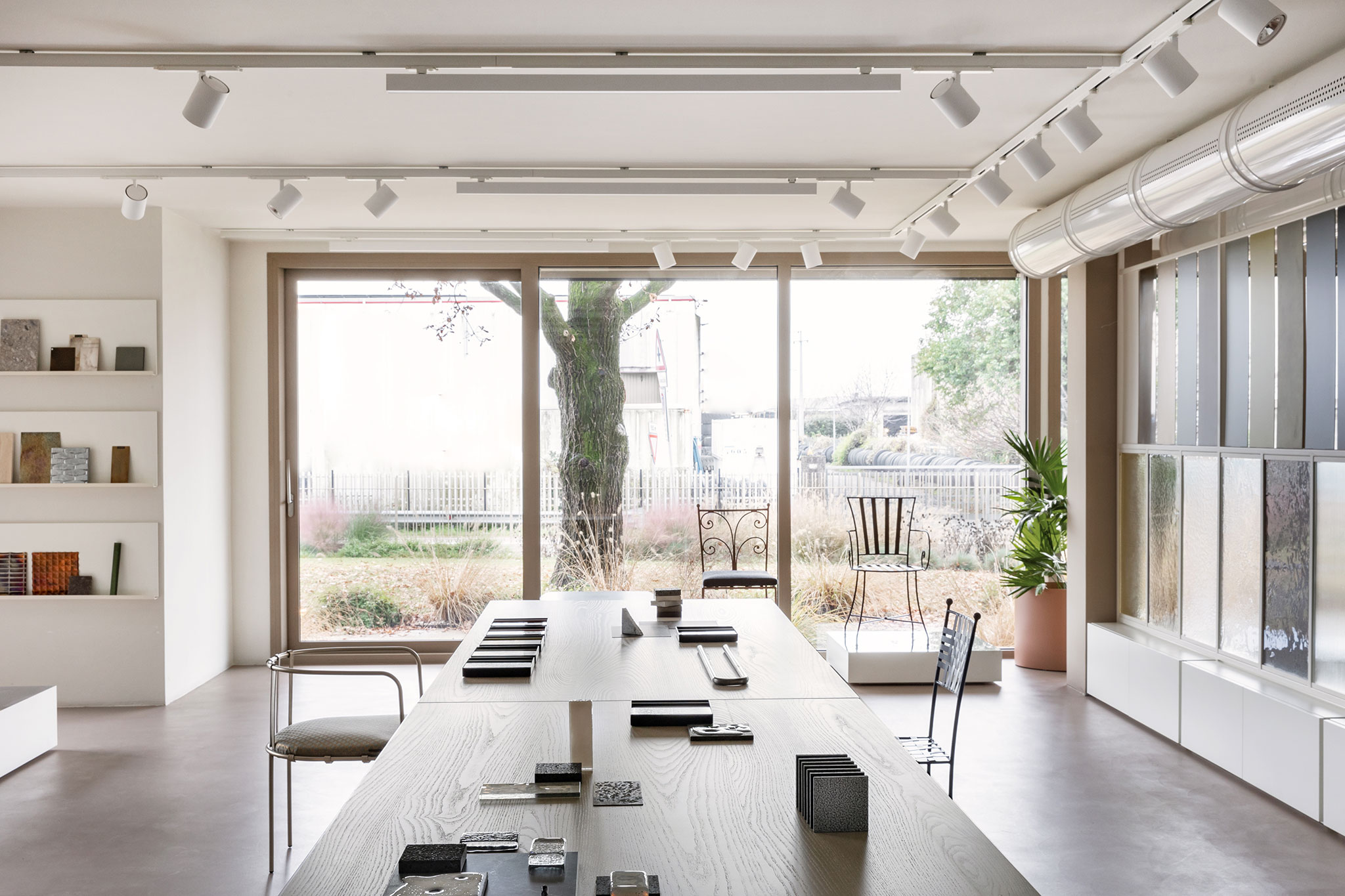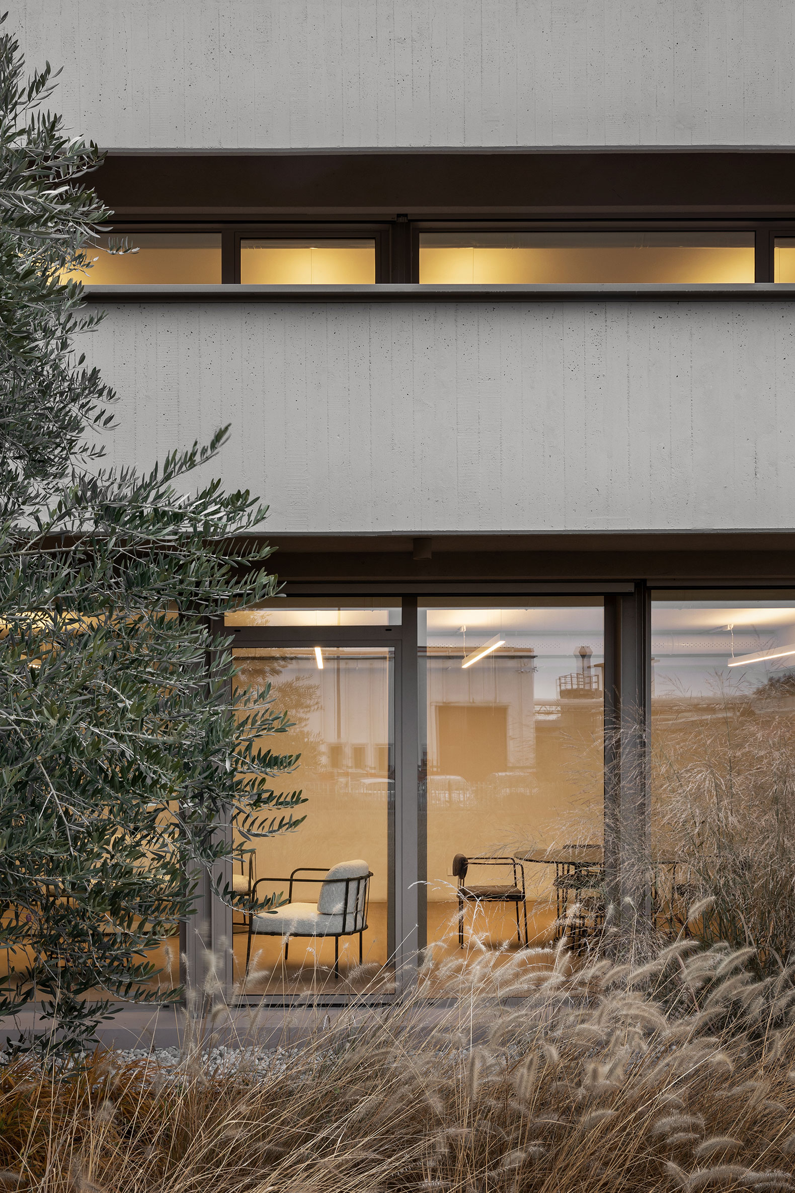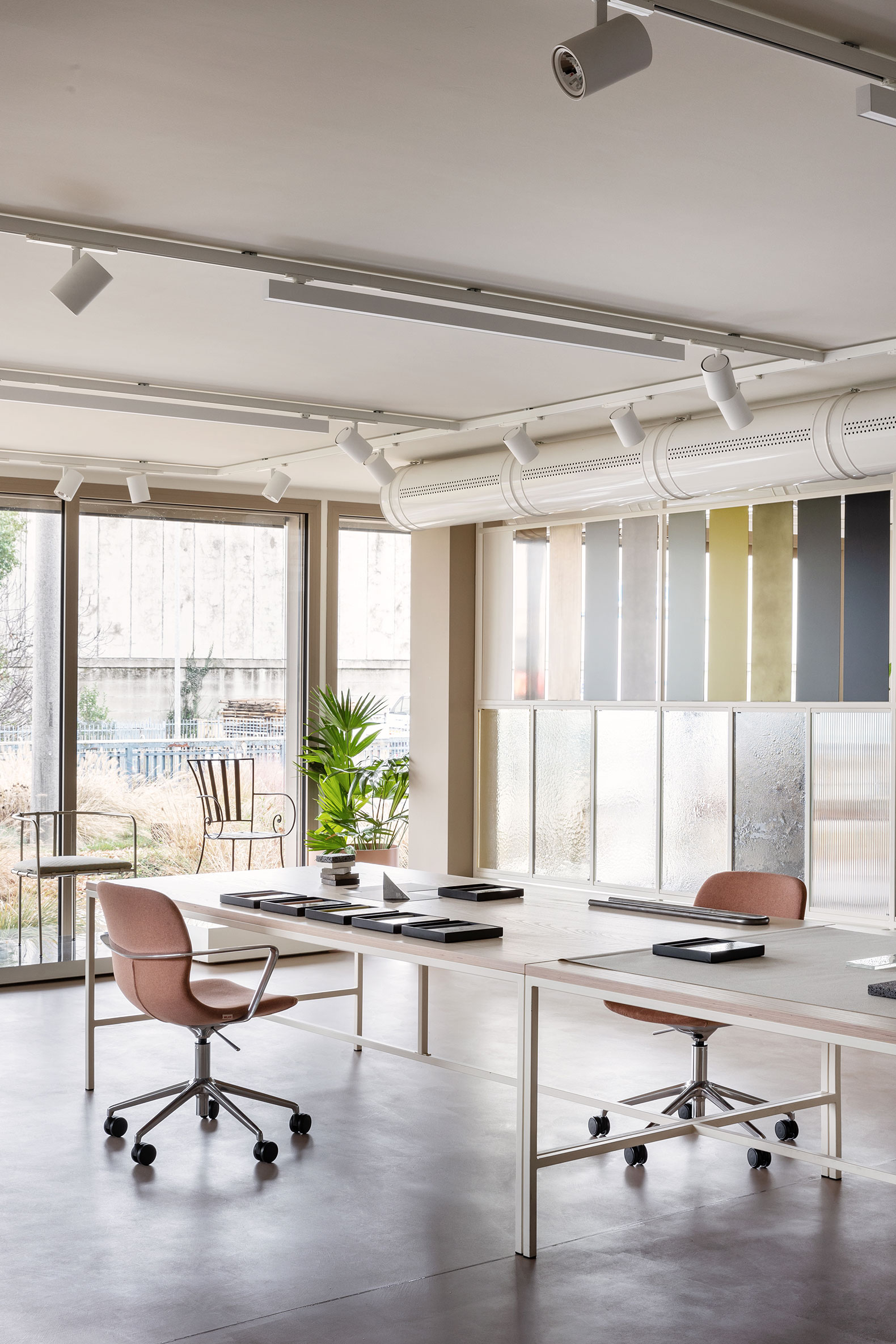 En esta renovación industrial para Dante Negro, Studio Bressan ubicó las oficinas, la biblioteca de materiales y los espacios técnico-administrativos en la sección principal de estilo brutalista, mientras que el área de producción se ubica en el volumen de doble bóveda.