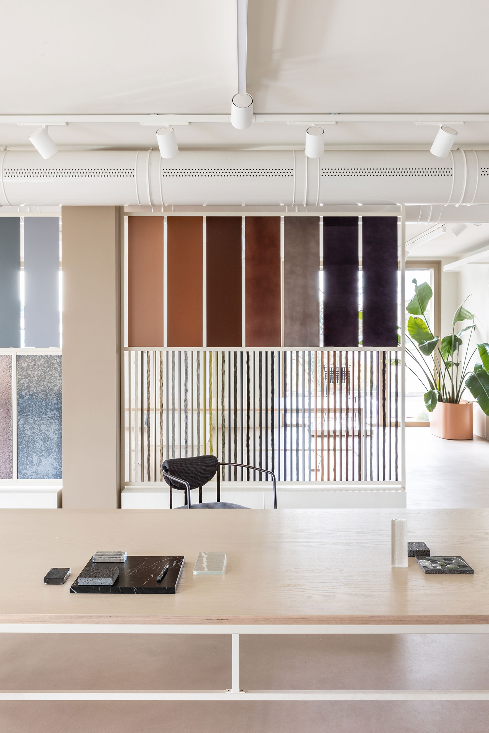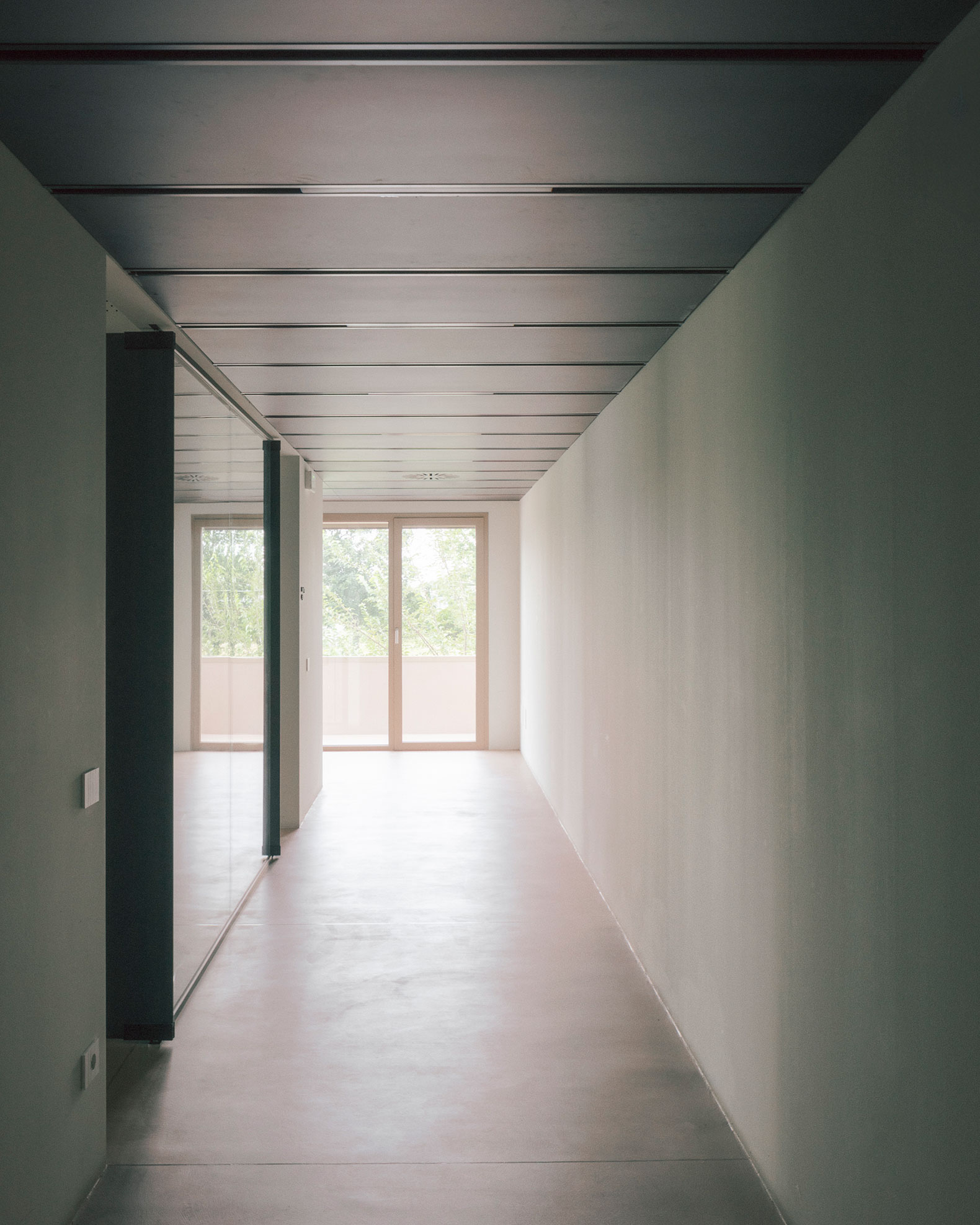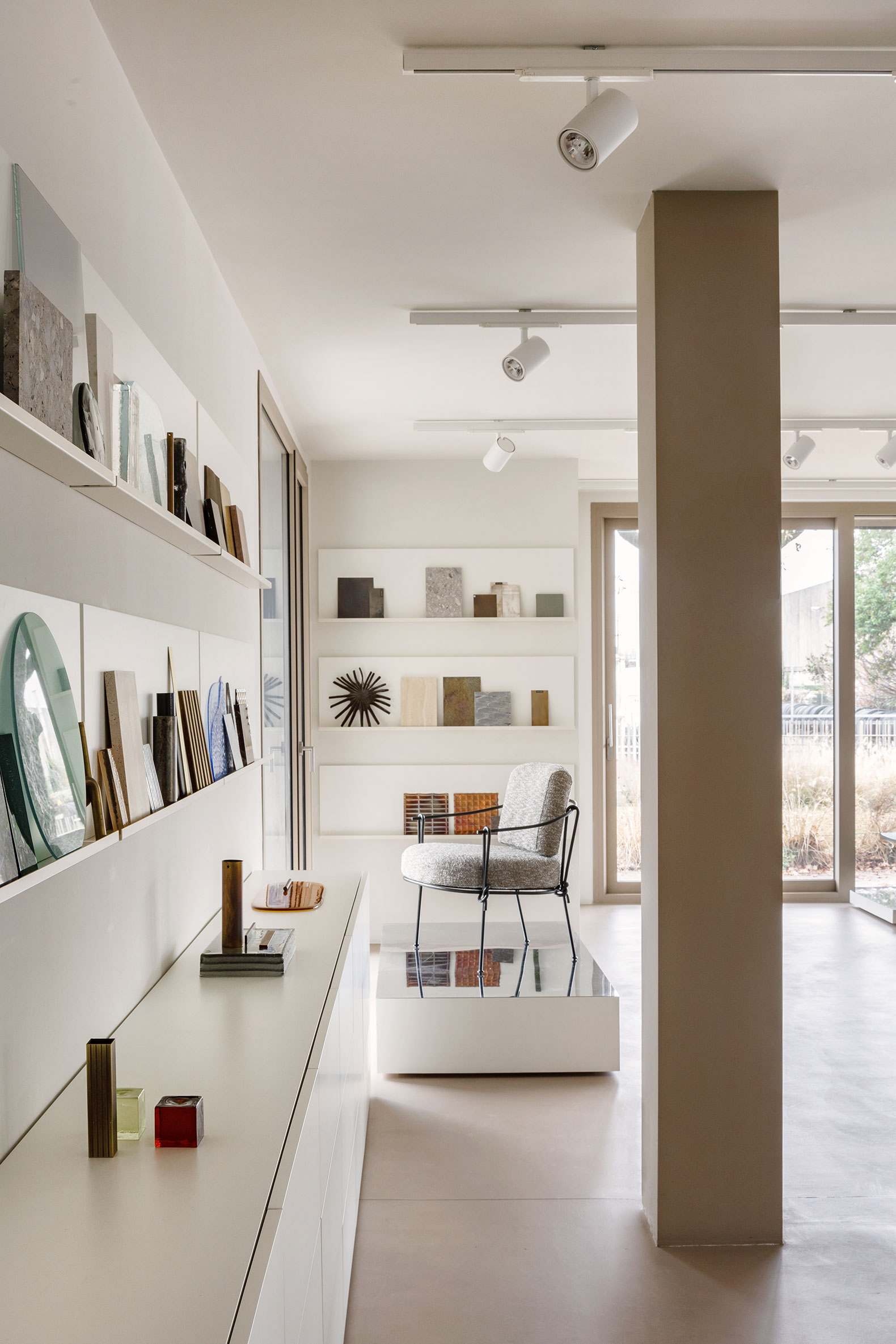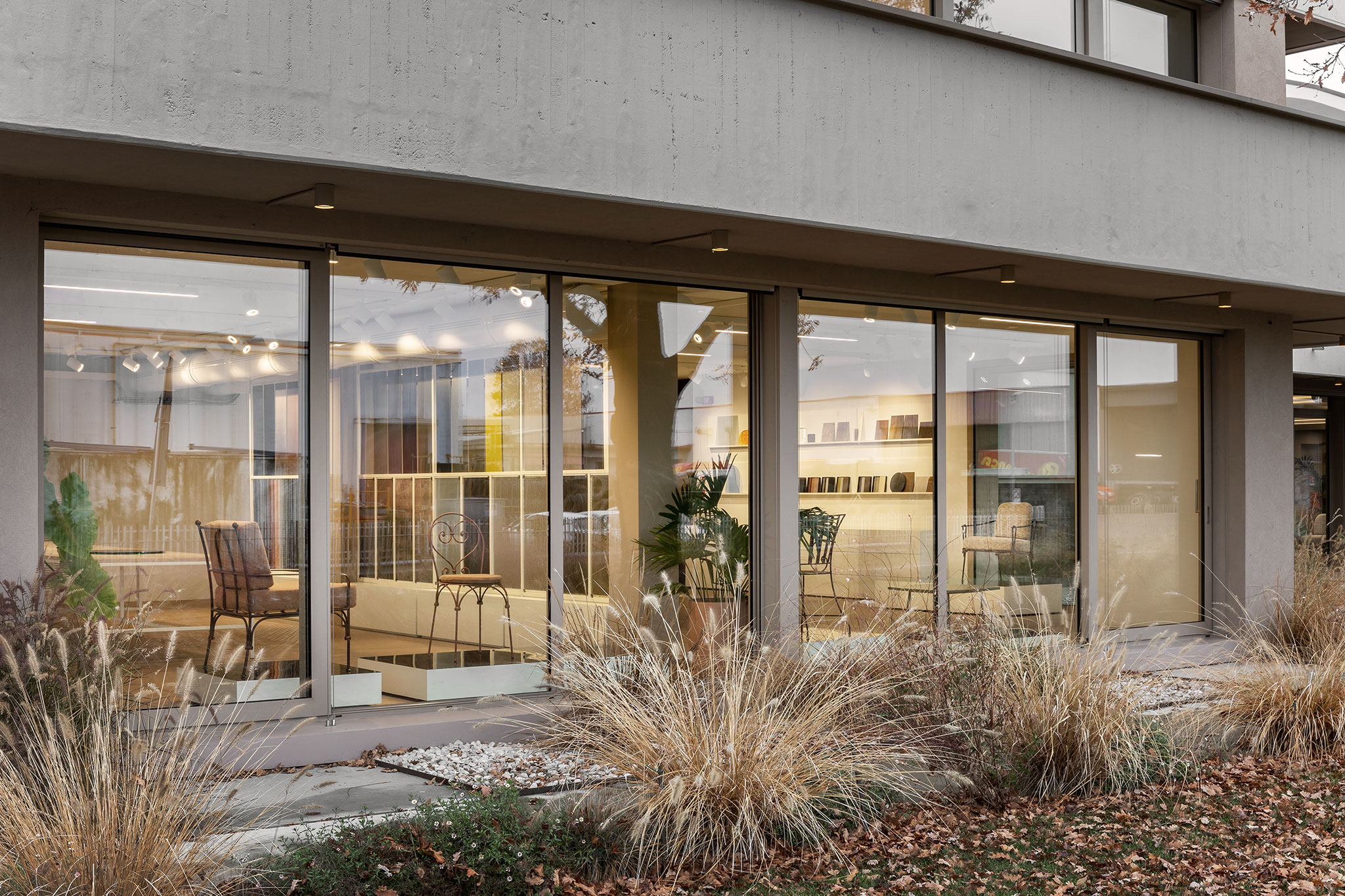 En esta renovación industrial para Dante Negro, Studio Bressan ubicó las oficinas, la biblioteca de materiales y los espacios técnico-administrativos en la sección principal de estilo brutalista, mientras que el área de producción se ubica en el volumen de doble bóveda.