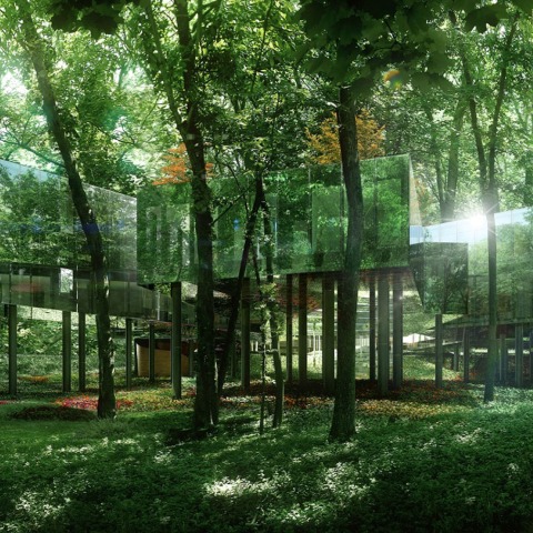 Debajo de los componentes elevados del proyecto hay un jardín rodeado por un anillo de vidrio transparente con una pasarela circular detrás de él, que conecta visualmente todas las casas. La pasarela circular está bordeada por una pared de madera de cerezo que se transforma en escaleras esculturales en forma de cinta dentro de los dos pabellones.