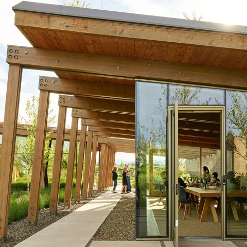 Las vistas en todo el complejo de treinta acres están controladas, ya sea al patio, a las colinas lejanas o a las vistas poco profundas de las oficinas privadas creadas entre el edificio y las bermas. Todo está pensado para crear un entorno tranquilo en el que trabajar.