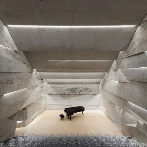 La sala desarrolla su acústica dentro del edificio aparentemente ligero. Mientras que las hendiduras de luz iluminan el espacio. El cuerpo del edificio está hecho de prefabricado de hormigón y sólo se ha utilizado un complejo encofrado para las formas más dificieles. Las superficies inclinadas dominantes de la sala de conciertos se basan en las especificaciones acústicas e incluyen, además de luces LED también absorbedores de graves detrás de las rendijas de luz, así como debajo de los pasos para tener una acústica óptima. El hormigón en la sala está sin tratar. Sus superficies animadas ayudan a absorber los tonos medio-altos.