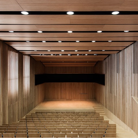 El interior propuesto por Robert Gutowski Architects se diseña cuidadosamente tomando especial atención a las prestaciones acústicas, así como su adecuación con el edificio existente.