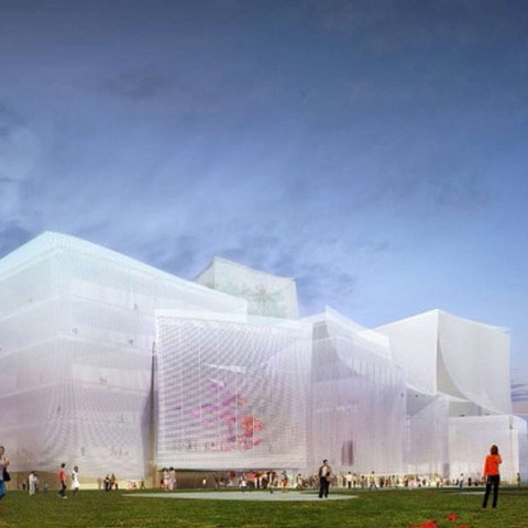 La propuesta ganadora consite en unos cubos blancos cuya fachada no está compuesta por muros verticales, sino por una cortina curva y transparente que expresa el movimiento y la relación del interior con el exterior.