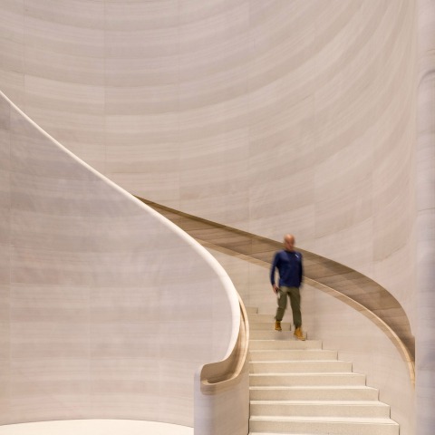 Las grandes paredes de piedra a ambos lados del interior cuentan con dos espectaculares escaleras curvas, talladas a mano por artesanos italianos de piedra Castagna, proporcionando bellos y bien esculpidos portátiles al gran espacio interior, un homenaje a la artesanía ya la materialidad. Las escaleras fluyen sin esfuerzo hasta el entresuelo con barandillas integradas que tienen un acabado táctil y liso.