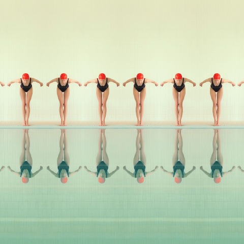 Piscina es un proyecto en marcha que Svarbova comenzó en 2014 motivada por la búsqueda de localizaciones sugestivas y por su fascinación por las piscinas públicas: su belleza estéril y geométrica genera el tono de estas fotografías. Casi todas las piscinas fotografiadas se construyeron en la era soviética en varias localizaciones de Eslovaquia, país de origen de la autora. Las figuras aparecen en movimiento, pero sin un aire de disfrute y juego. Los colores titilan suavemente en una atmósfera onírica y los nadadores, congelados en la composición, aparecen tan asépticos y fríos como los azulejos de las piscinas. A pesar del aire retro de los escenarios, las imágenes evocan cierta sensación de futuro paralelo, como de una fantástica utopía quebrada. No hay emoción ni individualidad. El desapego artificial creado por la visión de Svarbova permite un placer visual único, inalcanzable en la realidad.