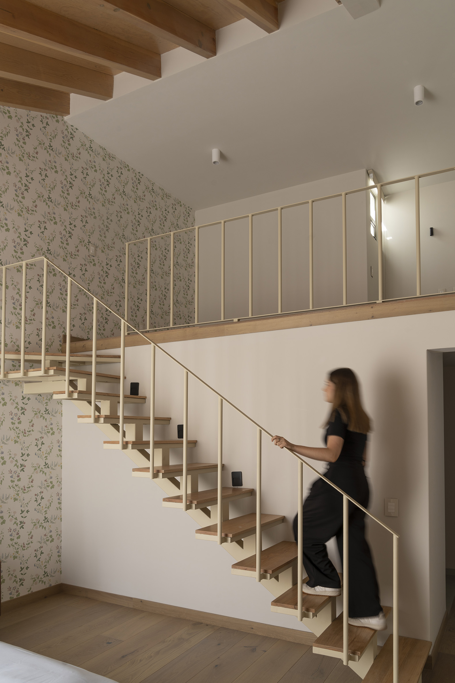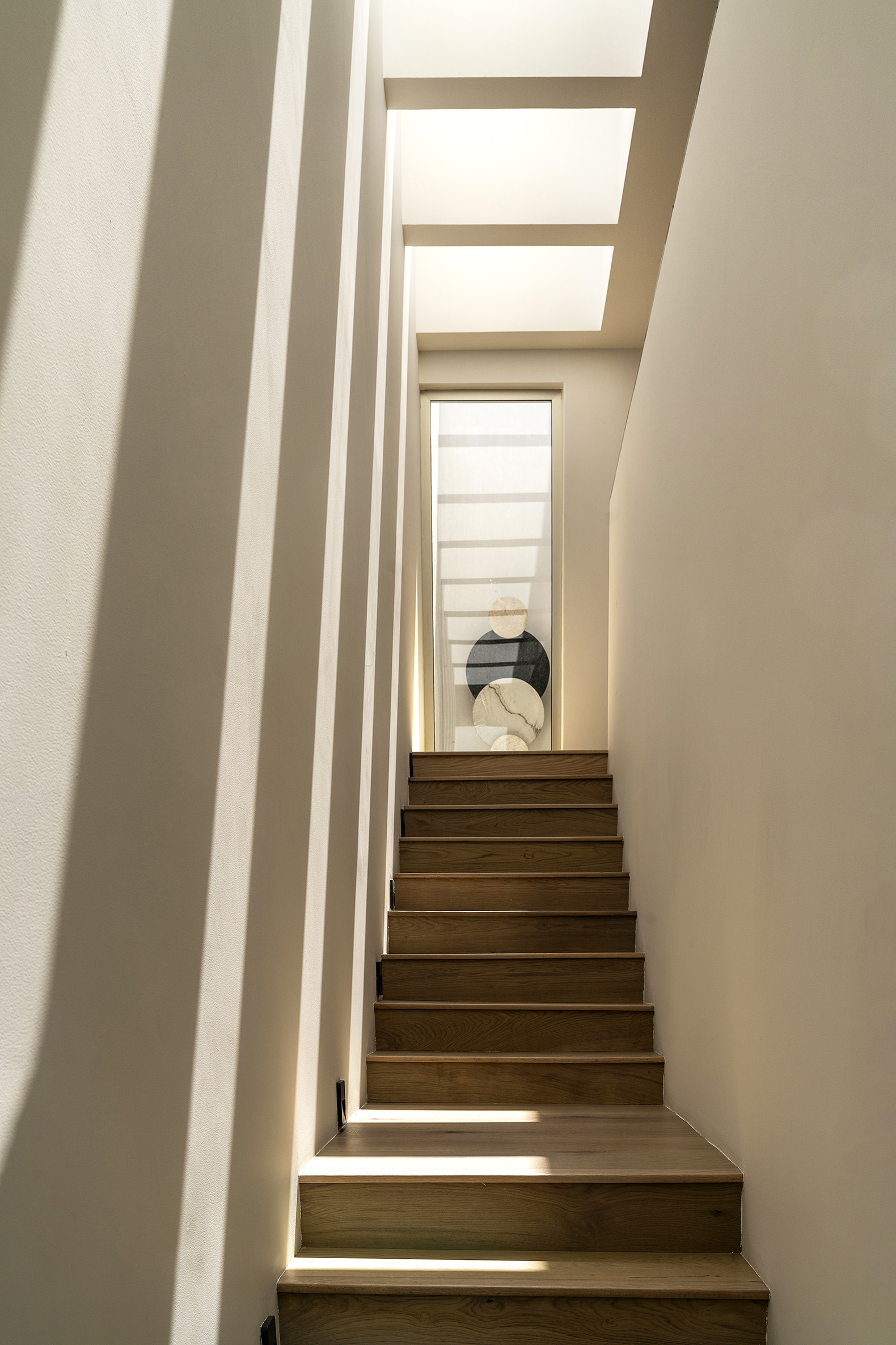 El sistema de escaleras principales se plantea como una secuencia dinámica, donde la luz incide de forma cambiante sobre los planos arquitectónicos, provocando una percepción activa del recorrido. En el remate visual, una escultura se posiciona estratégicamente para dialogar con el movimiento del usuario y subrayar la dimensión sensorial del ascenso.