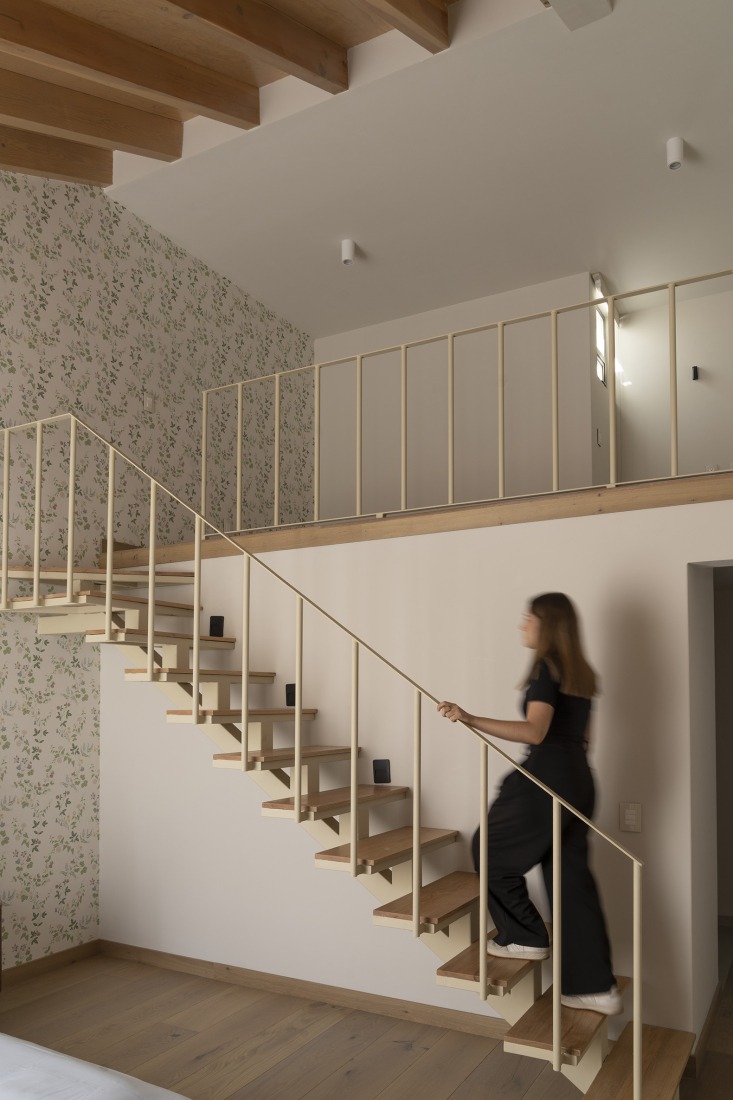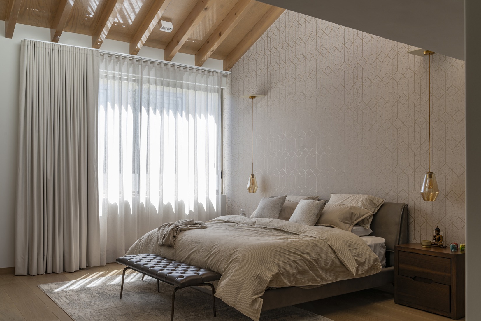 En las habitaciones secundarias, techos inclinados y dobles alturas enriquecen la volumetría interior, mientras tapancos suspendidos abren posibilidades lúdicas y funcionales. La recámara principal, por su parte, se eleva con un gesto similar: un techo a dos aguas enmarca el cielo desde una ventana alta, amplificando la sensación de apertura y reforzando la conexión íntima con el entorno natural.