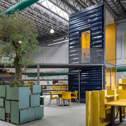 La entrada es la primera unidad funcional que define la simbiosis entre el pasado y la innovación solicitada al presente. Esta es la premisa sobre la cual se apoya el concepto creativo del proyecto, a través de un ambicioso programa para la creación y distribución de unos 60 puestos de trabajo en espacios abiertos, en una fusión entre las zonas de reunión, las zonas de trabajo en equipo, los espacios individuales y la descompresión y el tiempo de ocio previstos. El espacio abierto central articula así la comunidad en espacios de encuentro y de estar con espacios de trabajo en equipo en una convergencia de usos, funciones y escalas inequívocas tanto para los residentes como para los visitantes.
