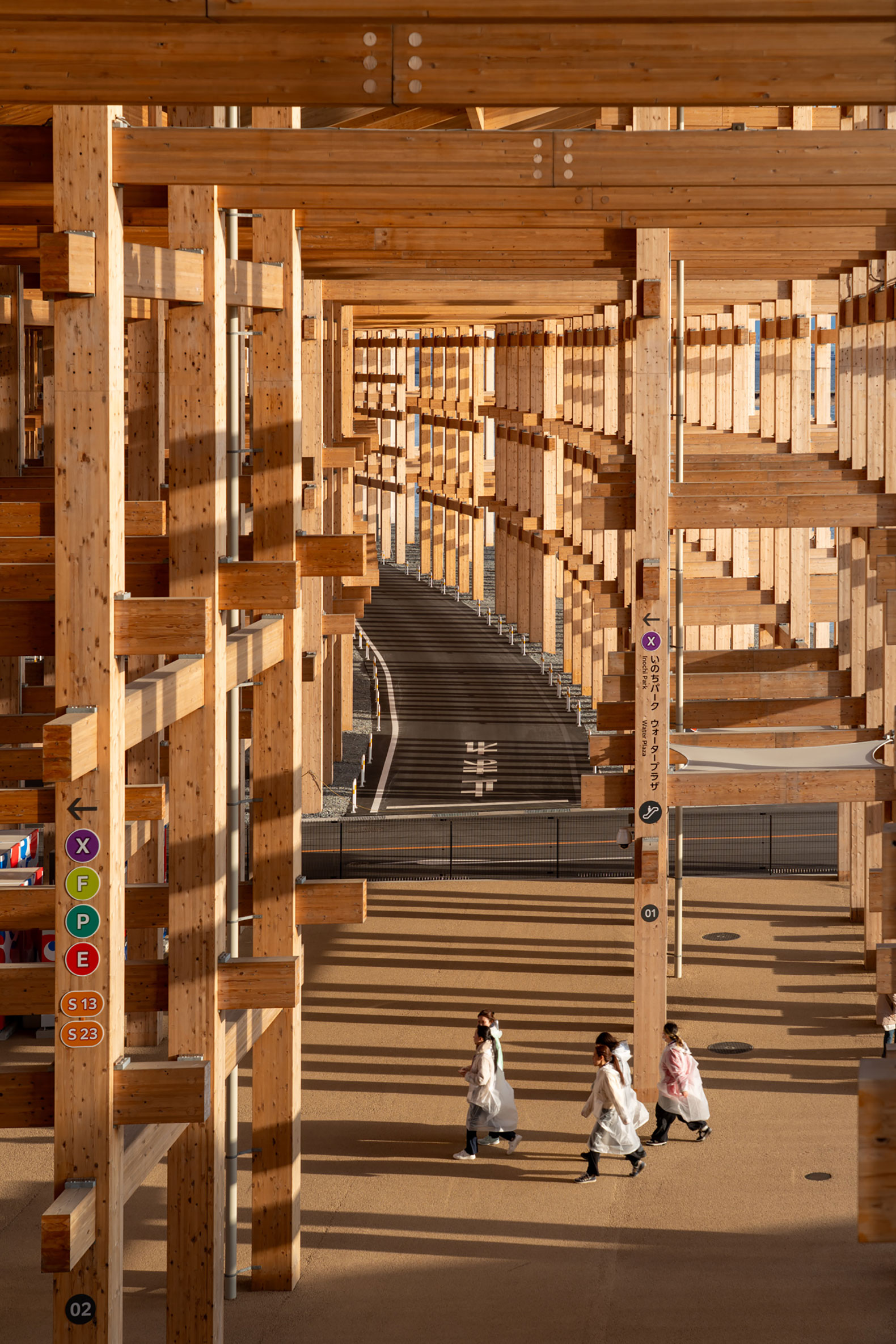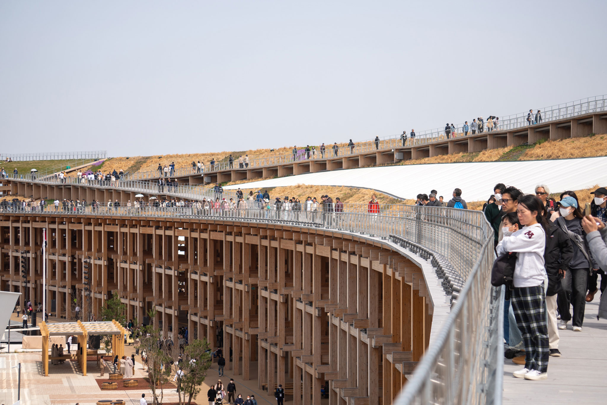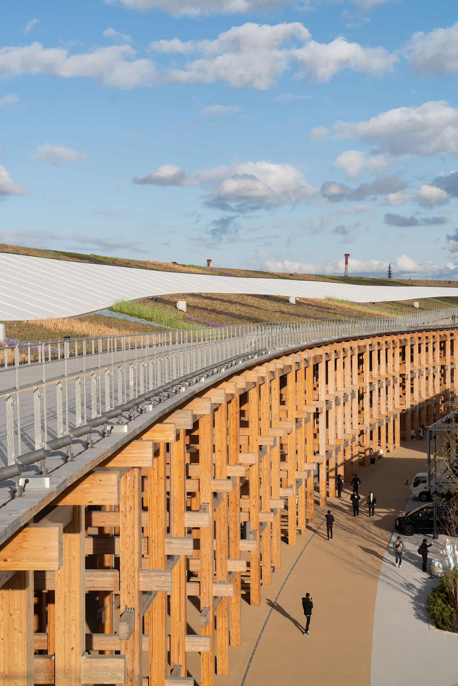 Posibilitando un movimiento fluido alrededor del sitio y ofreciendo a los visitantes un espacio cómodo protegido del viento, la lluvia y la luz del sol, El Gran Anillo simboliza el concepto de «Unidad en la Diversidad» entre los 150 países participantes de la Expo 2025 de Osaka.