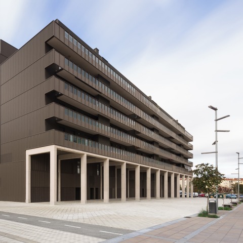 El proyecto de Vaillo+Irigaray Architects resuelve el porche orientado hacia la plaza con un pórtico de hormigón introduciendo una escala «institucional» al proyecto. Las fachadas tienen terrazas corridas en toda su longitud, camuflando calderas o los diferentes elementos que puedan afectar a la imagen exterior. Esto se consigue gracias a una a la estructura metálica exterior.