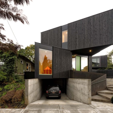 Situada en un terreno de relleno urbano con pendiente pronunciada, la propiedad tiene unos modestos 20 pies de ancho. Afuera, la casa está envuelta con una pantalla de lluvia de cedro ennegrecido que descansa sobre dos pulgadas de aislamiento rígido más aislamiento soplado dentro de las paredes. En el interior, el plan abierto cuenta con una sala de estar, una cocina y un comedor combinados, con cuatro dormitorios y tres baños y medio. Los interiores son luminosos, con amplios espacios con luz natural que destacan el techo de madera expuesta y los pisos de madera noble. Los baños están revestidos con una baldosa hexagonal personalizada y un patrón que se colocó en la tienda antes de la entrega. Los sistemas domésticos incluyen calefacción radiante en el piso, un sistema de recuperación de calor y un panel solar de 6 kilovatios instalado en la azotea. Las aguas pluviales del techo se gestionan a través de jardineras que se integran en el diseño del paisaje para minimizar la escorrentía del sitio. Se construyó una unidad adicional de vivienda auxiliar separada como parte de una segunda fase para una oficina en el hogar y almacenamiento.