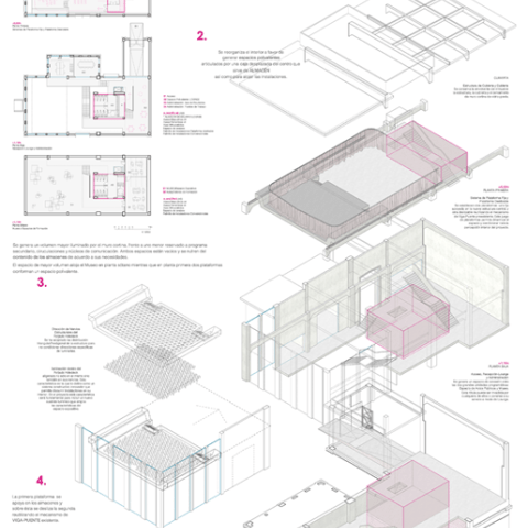 El objeto del Concurso es la Rehabilitación del antiguo Almacén nº5 de la Fábrica de Cementos Lafarge en Villaluenga de la Sagra (Toledo, España), reconvirtiéndose en un espacio multifuncional cuyo programa engloba acogida de visitantes, centro de formación, área expositiva- museo y espacio de convenciones.La propuesta parte de la puesta en valor del inmueble conservando el sistema estructural y el cerramiento de muro cortina.Se vacía el interior generando espacios polivalentes conectados por una caja desplazada del centro que sirve de ALMACÉN, de forma que se genera un volumen mayor iluminado por el muro cortina, frente a uno menor reservado a programa secundario, circulaciones y núcleos de comunicación. Ambos espacios están vacios y se nutren del contenido de los almacenes de acuerdo a sus necesidades.El espacio de mayor volumen aloja el Museo en planta sótano mientras que en planta primera dos plataformas conforman un espacio polivalente.