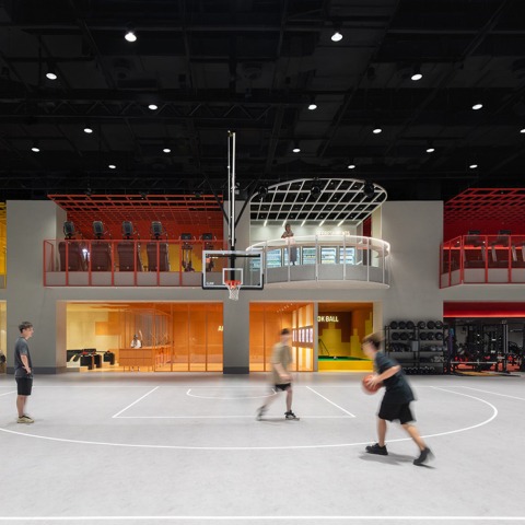 Como complemento a los espacios coloridos, el atrio y las áreas de descanso están revestidos en tonos neutros de gris y madera para irradiar una atmósfera relajada. Combinando escalada, baloncesto y boxeo, el espacio de techo alto también está equipado con un escenario central y una pantalla LED de 15,5 x 6,5 m para clases grupales o retransmisiones de partidos. Haciendo eco de los círculos de una cancha de baloncesto que a menudo se utilizan para reiniciar un juego, los dos balcones semicirculares sobresalen como «espacios en blanco» para observar o hacer una pausa entre las acciones circundantes.
