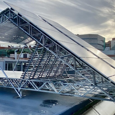 Sol y sombra. La pérgola fotovoltaica es una estructura de soporte de paneles solares que generan energía eléctrica para el autoconsumo de una oficina y al mismo tiempo da sombra a un espacio de descanso al aire libre para sus empleados. Adicionalmente se reduce el recalentamiento de la cubierta.