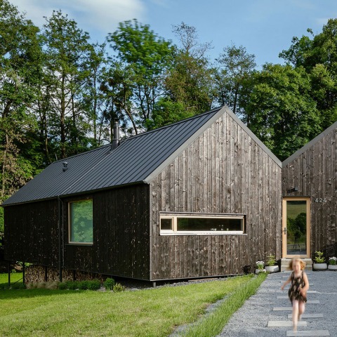 Dos volúmenes alargados con tejados a dos aguas se unen en ángulo y se sitúan en el límite de la zona edificable, definida por los retranqueos. A primera vista, esta forma puede parecer una reminiscencia de la típica casa pequeña de una sola planta con tejado a dos aguas de la región de Beskydy. La solución con dos alas funciona bien para separar la casa familiar y la futura suite para los suegros. Dentro del ángulo se forma un patio privado orientado al sur, protegido del norte y con vistas a un bosque cercano. A la sombra del voladizo del tejado, una amplia terraza que se extiende a lo largo de la casa la conecta con el patio, ofreciendo infinitas posibilidades para sentarse, relajarse y escuchar los sonidos del agua corriente, el susurro de las hojas o el zumbido lejano de la vida del pueblo. Los árboles maduros que crecen alrededor del arroyo dan sombra al caluroso sol del verano, pero sus ramas desnudas dejan pasar suficiente luz solar para llegar a la casa en invierno.