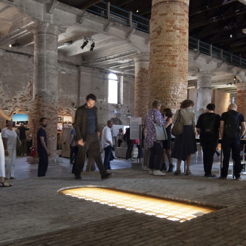 Una reproducción 1:1 del muro hecho de ladrillo veneciano del espacio de exhibición, pavimenta el piso del Arsenale para crear un nuevo borde. Al quitar el muro, el espacio público se integra a la esfera privada.